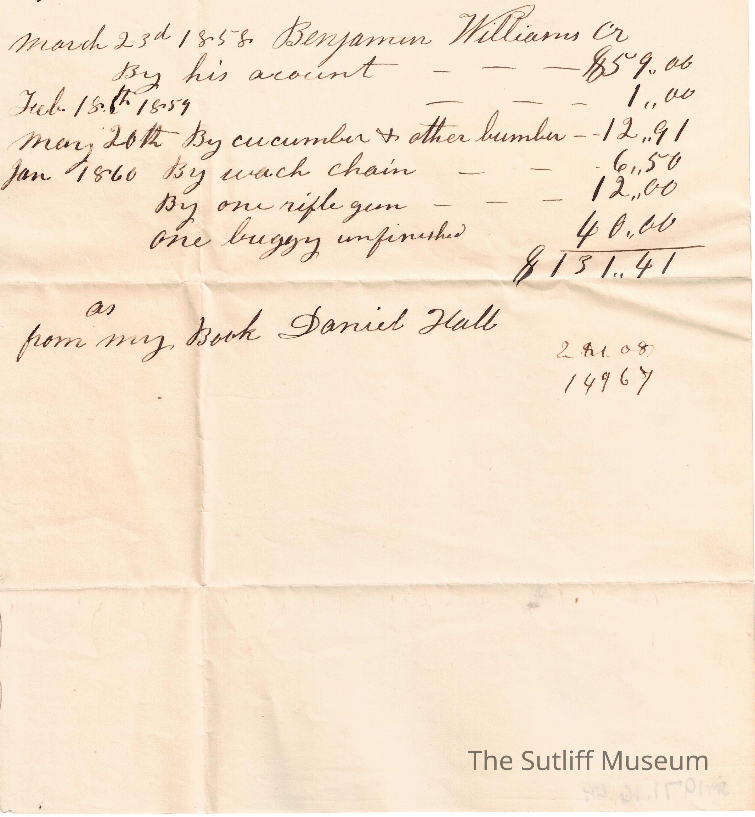 From the book of Daniel Hall, an account of Benjamin Williams payments. A receipt.Relationships