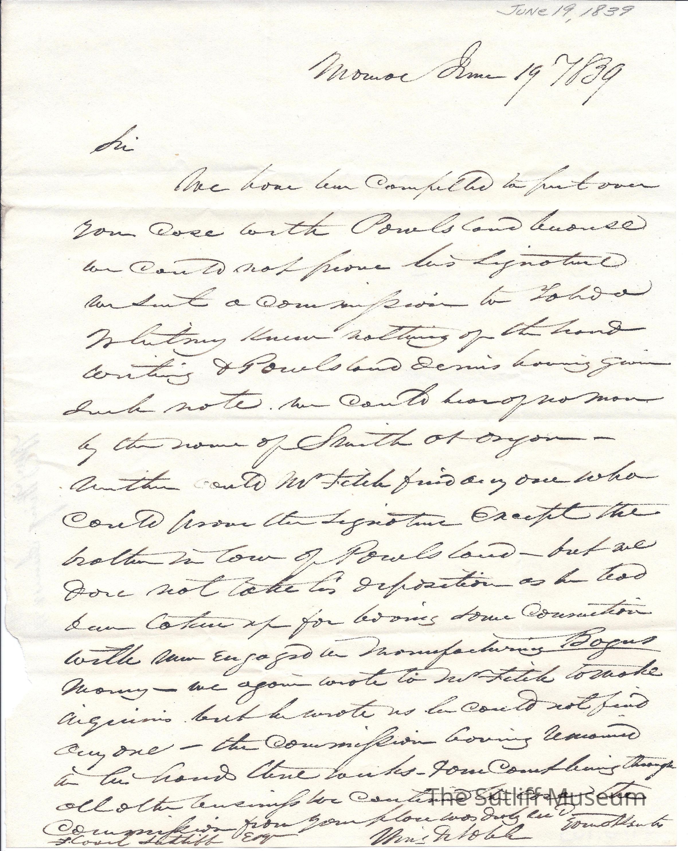 [Wing & Noble] to Flavel Sutliff. A letter perhaps from a court official informing Flavel as case has been delayed due to conjecture about handwriting.