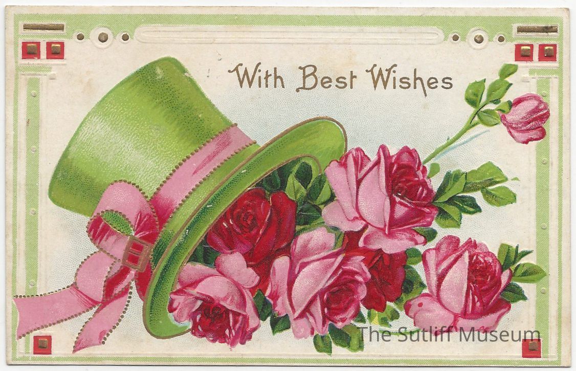 A postcard depicting a green hat with a pink ribbon and several pink roses. The phrase "With Best Wishes"