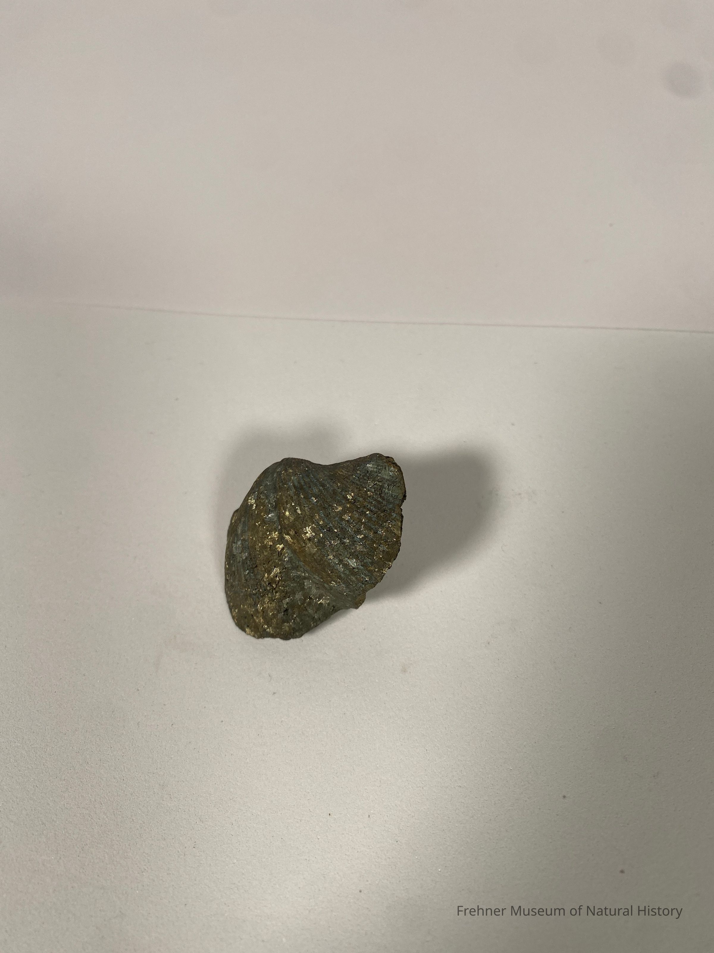 This Brachiopod Shell has been replaced with Pyrite to give it a golden, metallic appearance. Species: Paraspirifer bownockeri FM2012.1.194