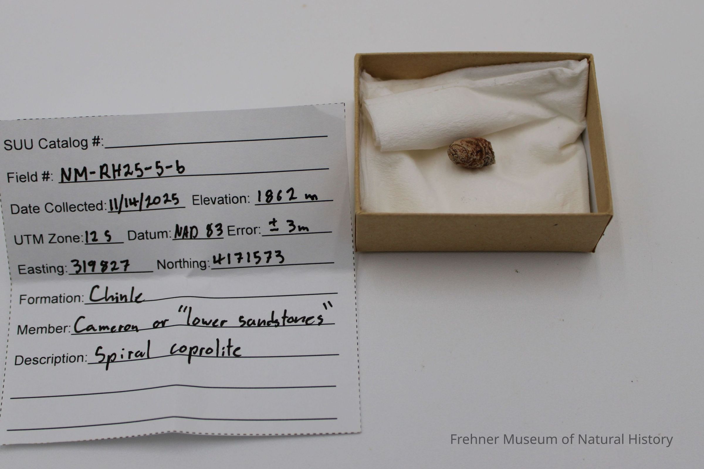 Collected by Nathan Martin on 11/14/2025 on Red Hill (Cedar Canyon). Pulled from Chinle Formation, Cameron or "lower sandstones" Member. May be of interest as it is a spiral shape, most likely from some kind of fish.Collection