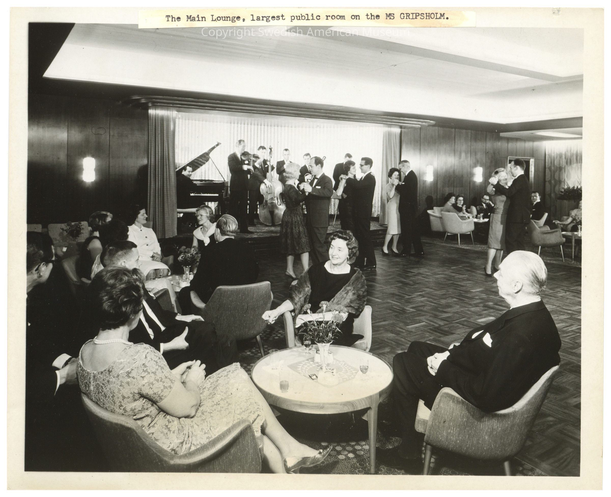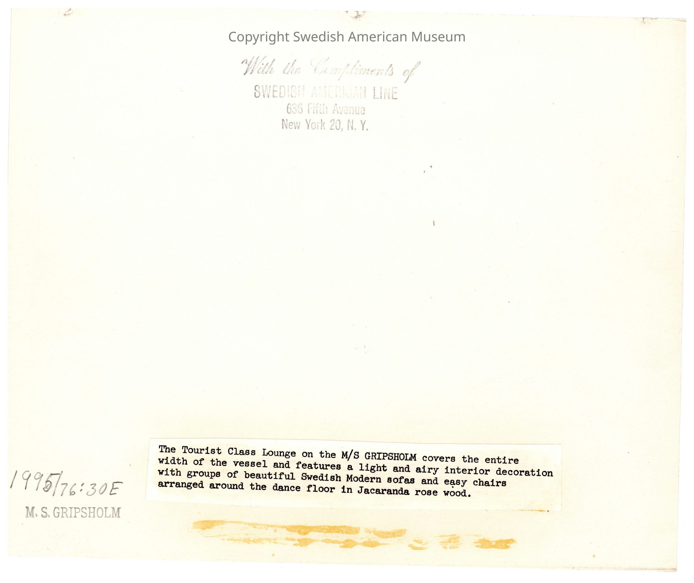 Black-and-white photograph of the Swedish American Line. MS Gripsholm - Tourist Class Lounge. Back of the photograph reads "The Tourist Class Lounge on the M/S GRIPSHOLM covers the entire width of the vessel and features a light and airy interior decoration arranged around the dance floor in Jacaranda rose wood."Photograph Details