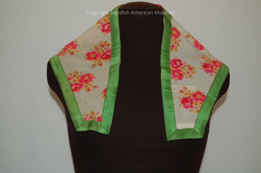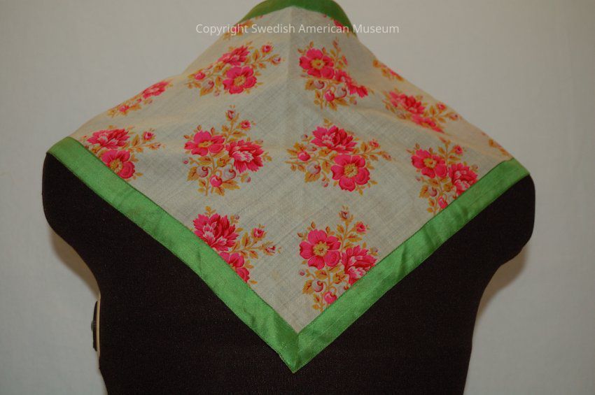 Triangular scarf; pink and yellow floral pattern on off-white background; green satin trim on edge. Part of Swedish folk costume (folkdräkt) from Rättvik, Dalarna for young girl that includes a skirt, a blouse, a dickie, a scarf, two hats, stockings, and a brooch.Context