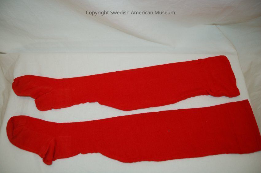 Pair of red cotton stockings. Part of Swedish folk costume (folkdräkt) from Rättvik, Dalarna for a young girl that includes a skirt, a blouse, a dickie, a scarf, two hats, stockings, and a brooch.Context