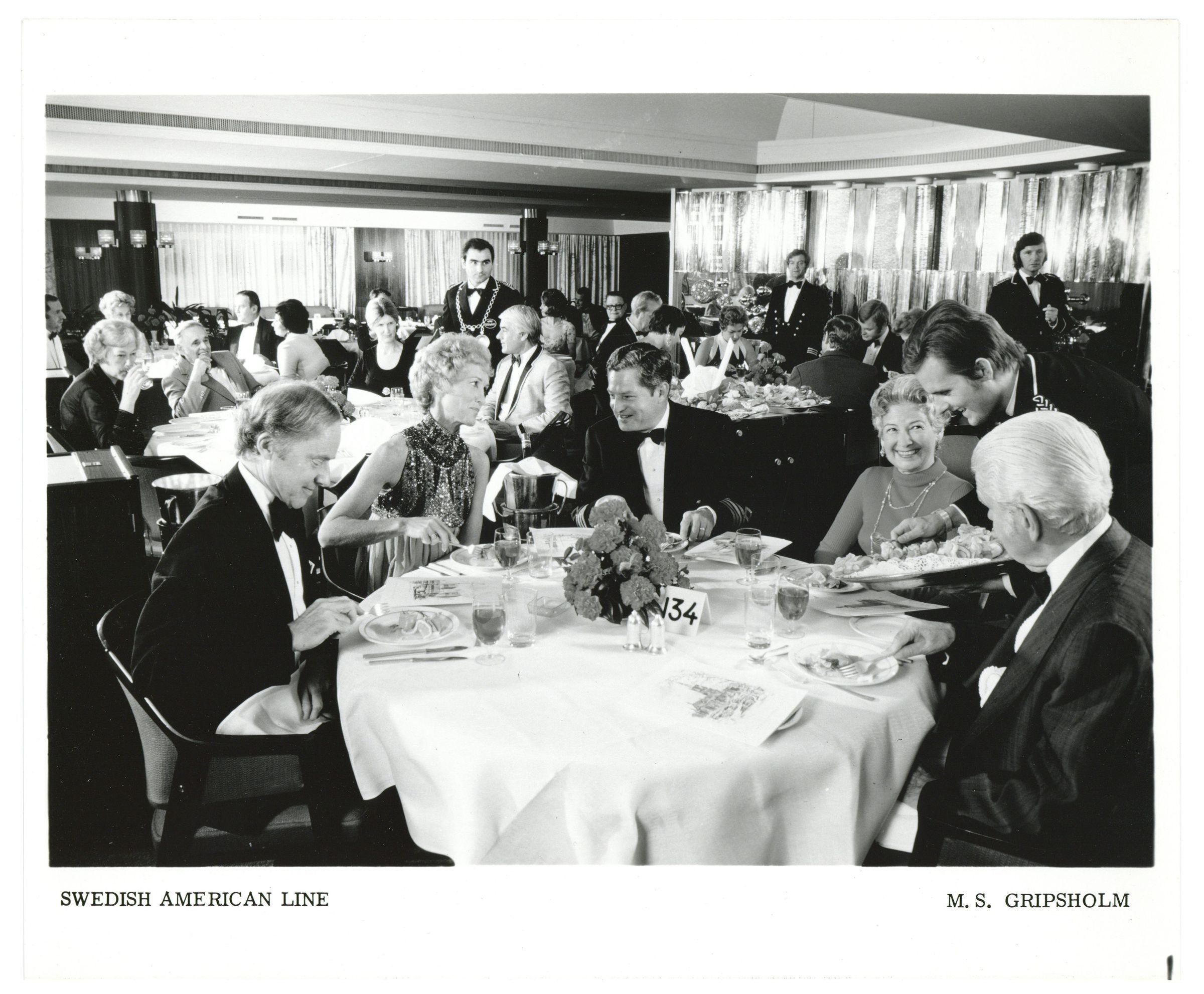Black-and-white photograph of the Swedish American Line. MS Gripsholm - Dining Room. Depicts people in a dining room sitting around circular tables. The table closest in the foreground has a number card that reads "134." The people are dressed in suits and nice clothing.Photograph Details