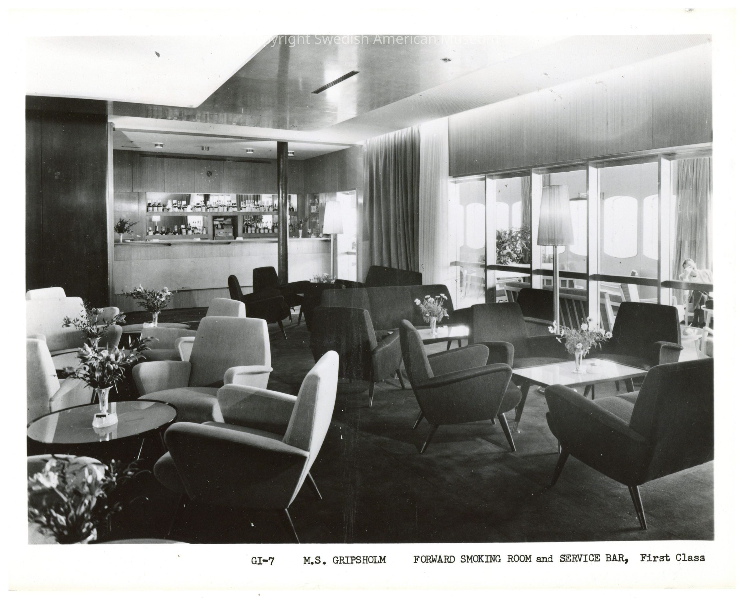 Black-and-white photograph of the Swedish American Line. MS Gripsholm - Forward Smoking Room and Service Bar. First-Class. The room is empty. Chairs and tables with vases of flowers with a bar are seen in the background.Photograph Details