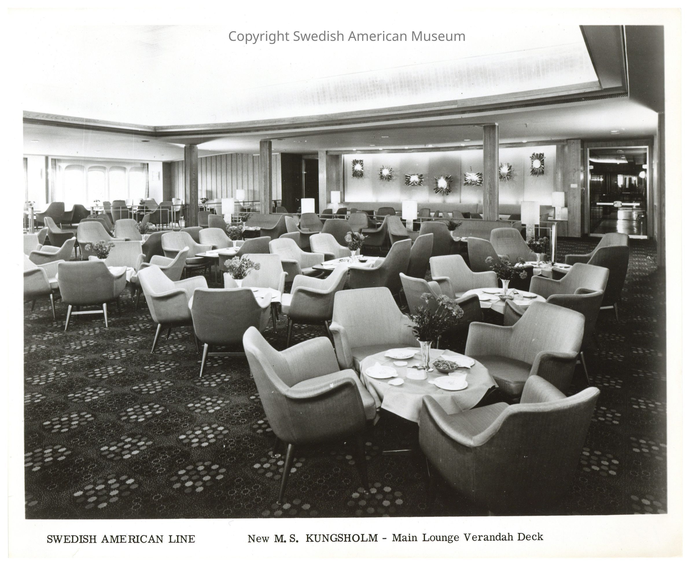 Black-and-white photograph of the Swedish American Line ship MS Kungsholm - Main Lounge Verandah Deck. Chairs and tables with flowers and set with plates. The lounge is empty of people.Photograph Details