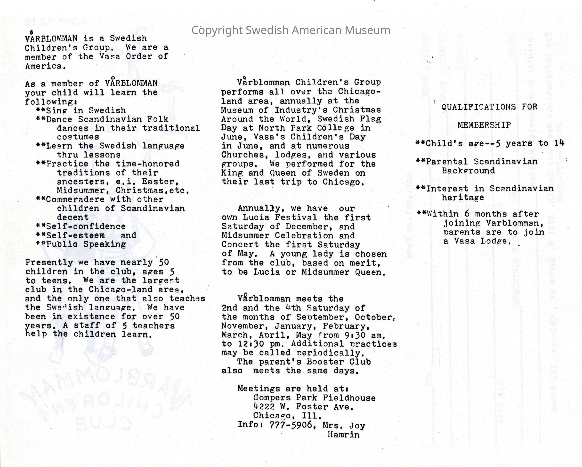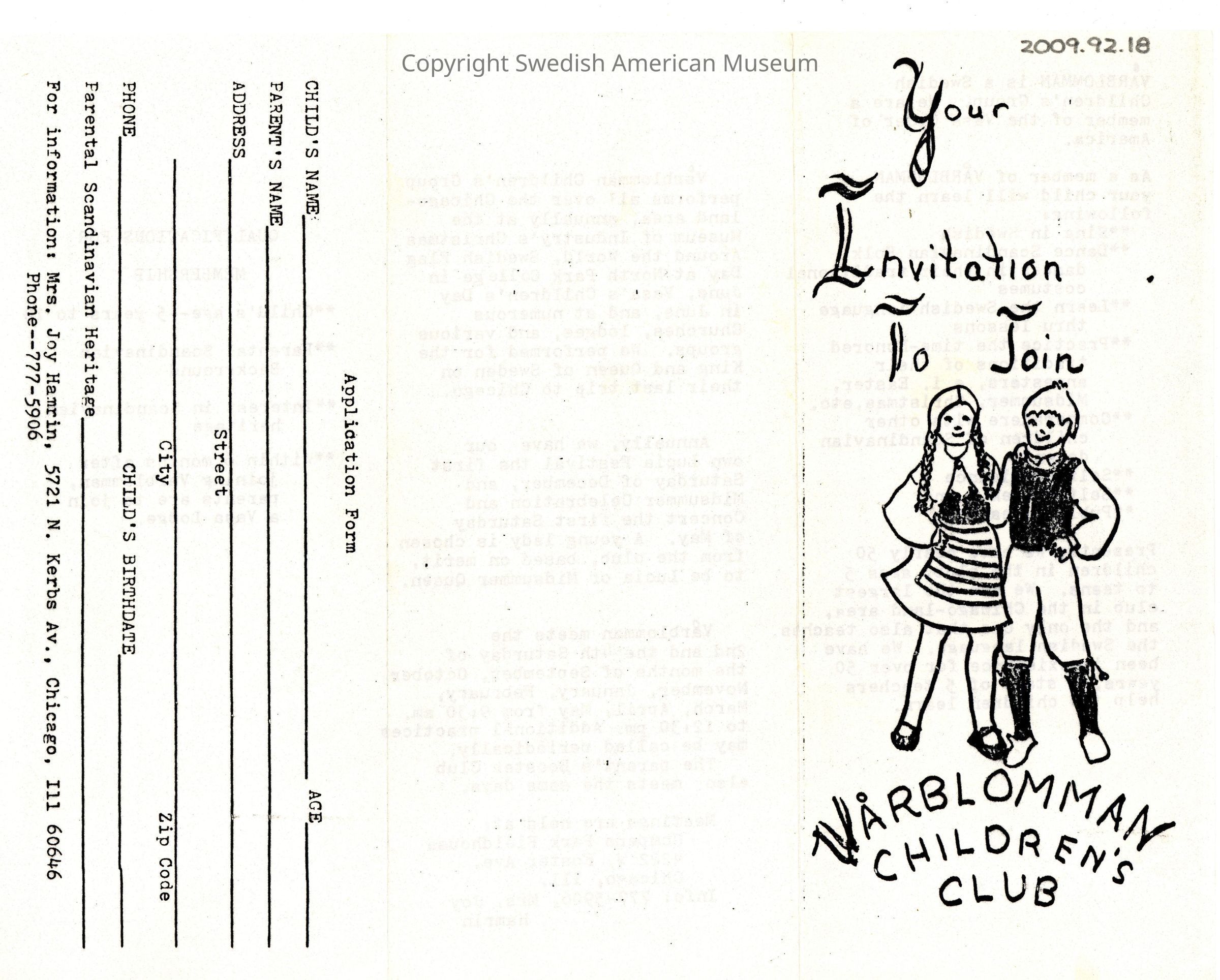 Invitation to join Vårblomman Children's Club in Chicago, Illinois.Context
