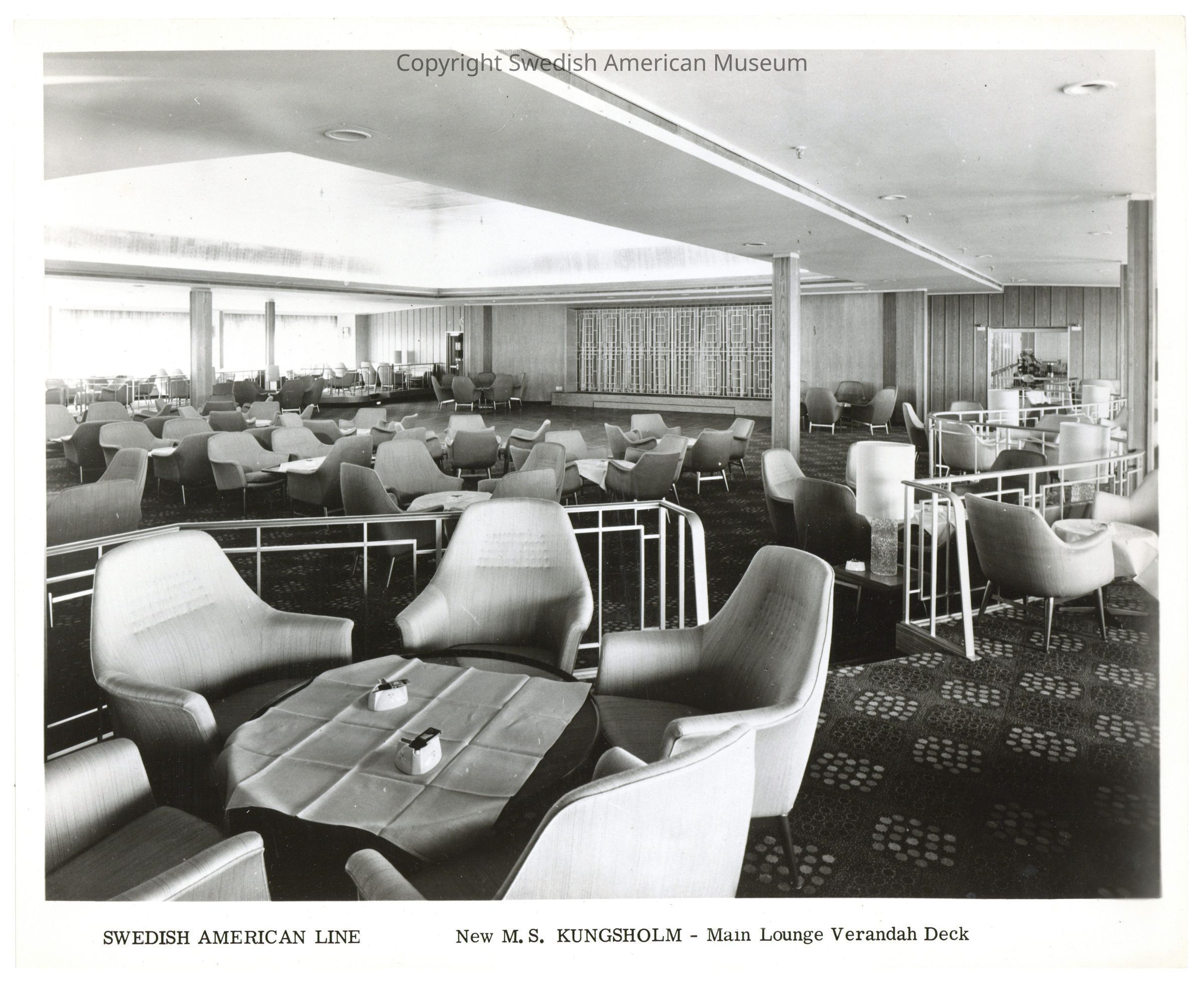 Black-and-white photograph of the Swedish American Line ship MS Kungsholm - Main Lounge Verandah Deck. Several tables and chairs can be seen.Photograph Details