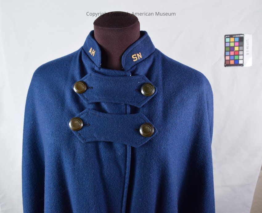 Cloak or cape part of a Augustana Student Nurse Uniform. Blue with a predominantly red interior. The upper section of the front's exterior has two attached blue bow-shaped structures, each of which connects to the cape's main part with two black buttons, one of which is on the respective left side and one of which is on the respective right side and a pocket which has a predominantly blue exterior and a predominantly red interior.Context