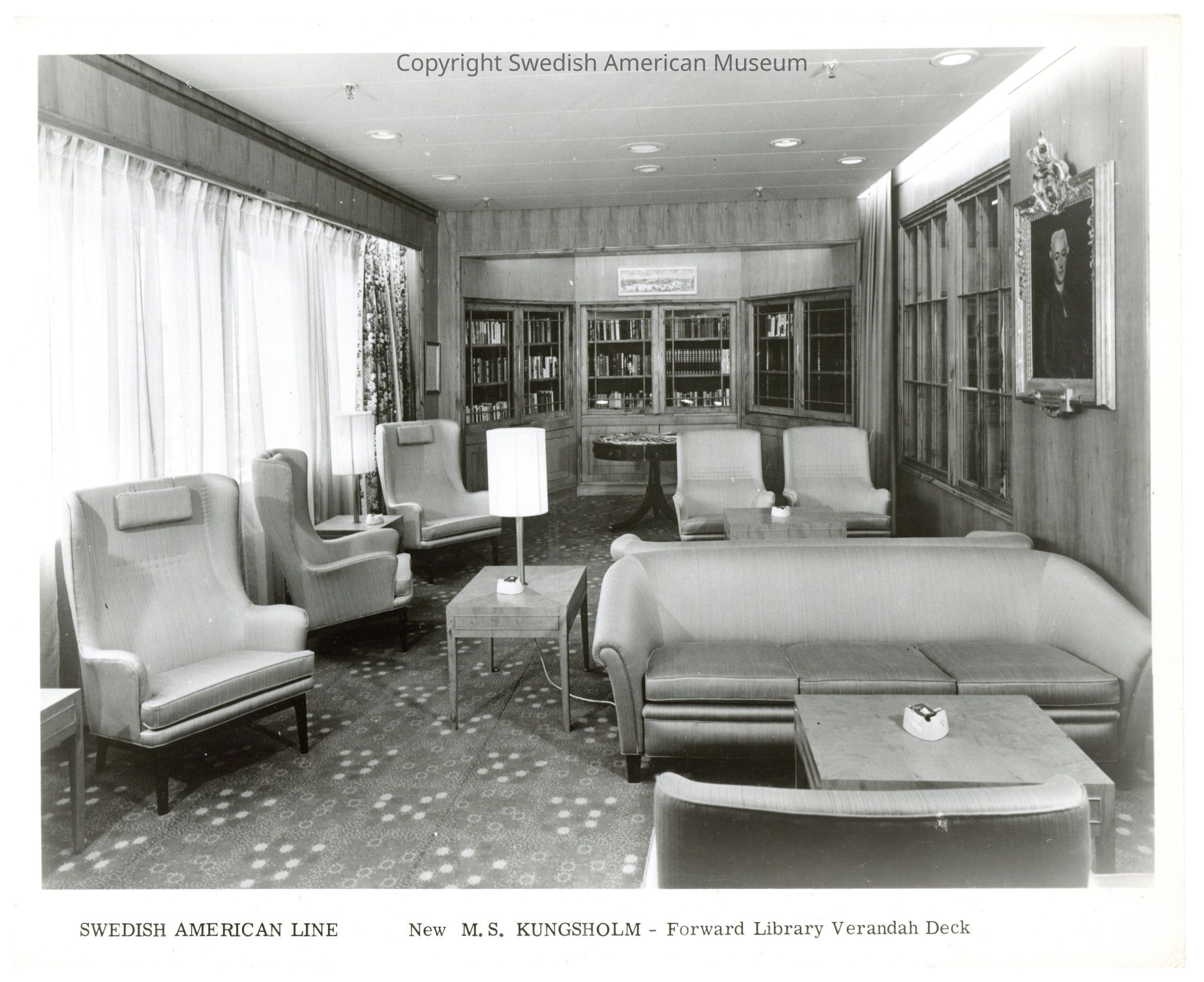 Black-and-white photograph of the Swedish American Line ship MS Kungsholm - Forward Library - Verandah Deck. There are no people in the picture. There are chairs and a couch, with bookshelves on the back wall. A portrait of a man hangs on the right side wall.Photograph Details