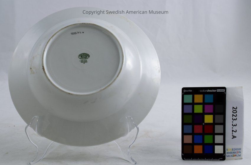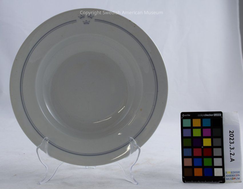 Large bowl from the Swedish American Line. White with two blue lines around the edge and a three crowns emblem on one side.Context