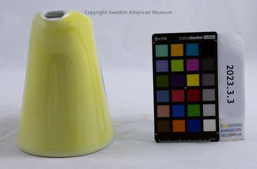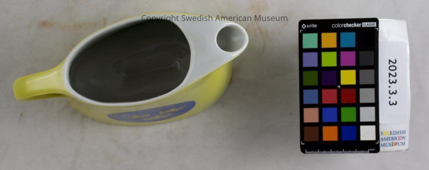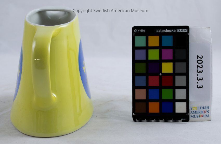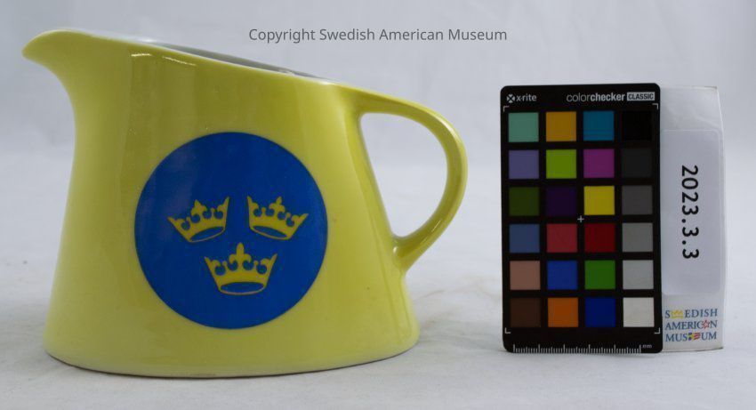 Pitcher from the Swedish American Line (SAL). This pitcher was presented to Kurt Matthiason, founder of the Swedish American Museum by the SAL. The pitcher is yellow and has a three crowns emblem in a blue circle on both sides. On the bottom is a maker's mark what looks like two swords crossing and the letters "W, C, G, K" (order in clockwise).Context