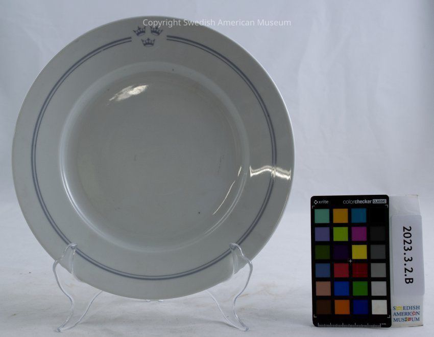 Dinner plate from the Swedish American Line. White with two blue lines and an emblem of three crowns at one side.Context