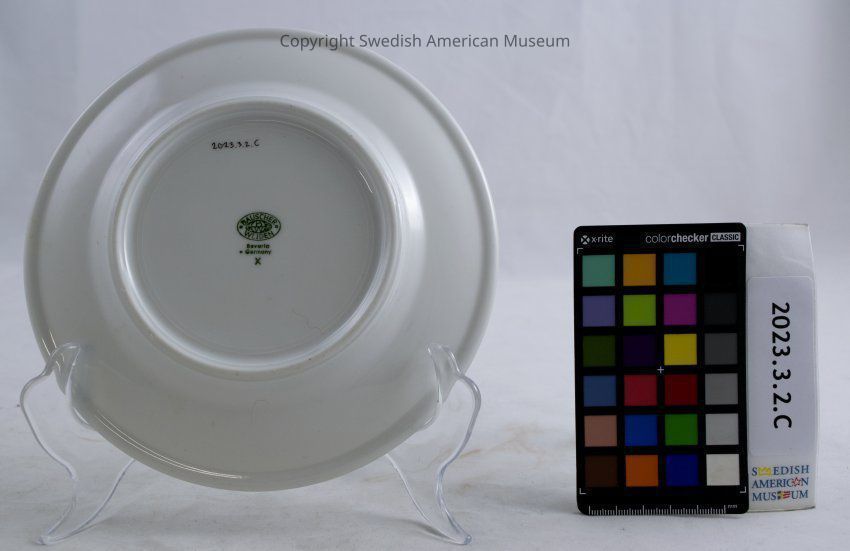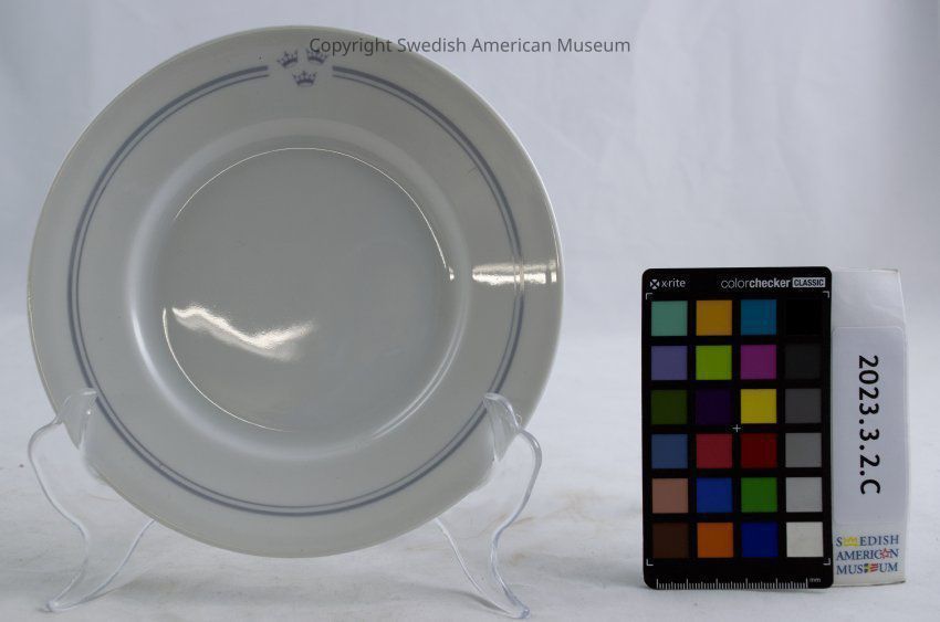 Small plate from the Swedish American Line. White with two blue lines around the edge and a three crowns emblem on one side.Context