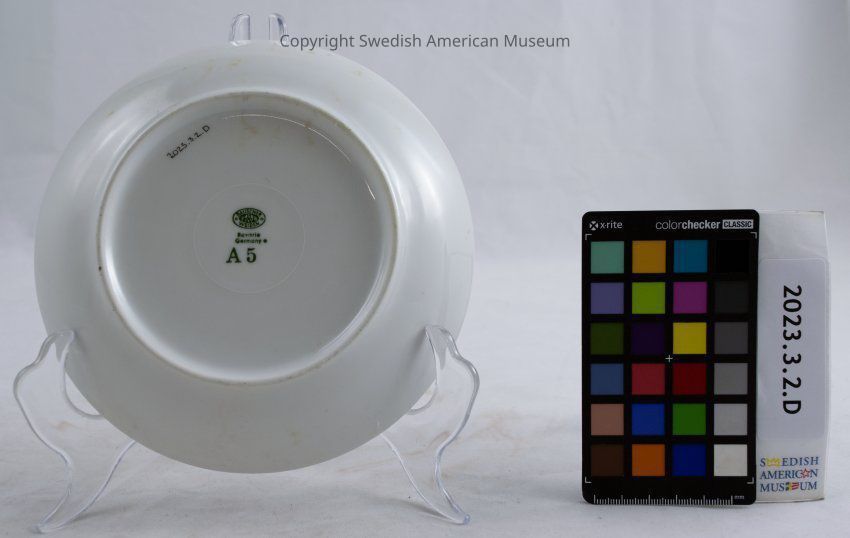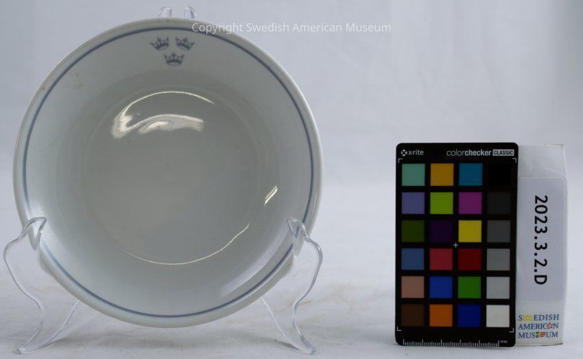 Small plate from the Swedish American Line. White with a blue line around the edge and a three crowns emblem on one side.Context