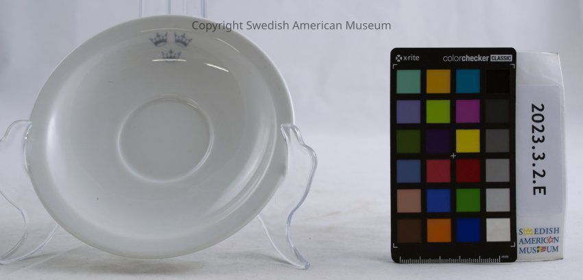 Saucer from the Swedish American Line. White with a three crowns emblem on one side.Context
