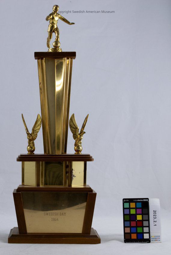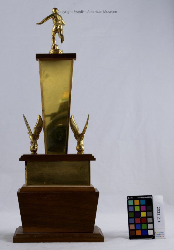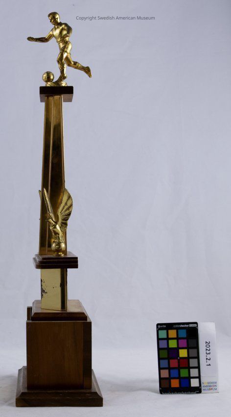 Trophy that the Viking Athletic Association's soccer team won in 1964 for Swedish Day, competing against a Norwegian team. The trophy plaque reads "O. M. Nordling / Trophy / Swedish Day / 1964." The trophy has a man kicking a soccer ball on the top and two eagles perched on the sides. It is painted gold.Context