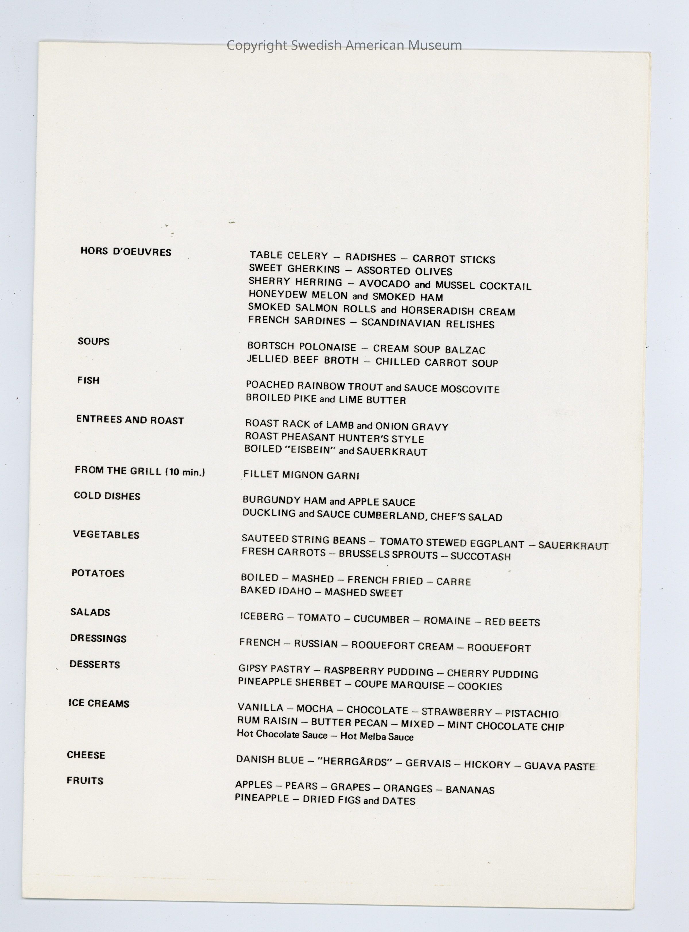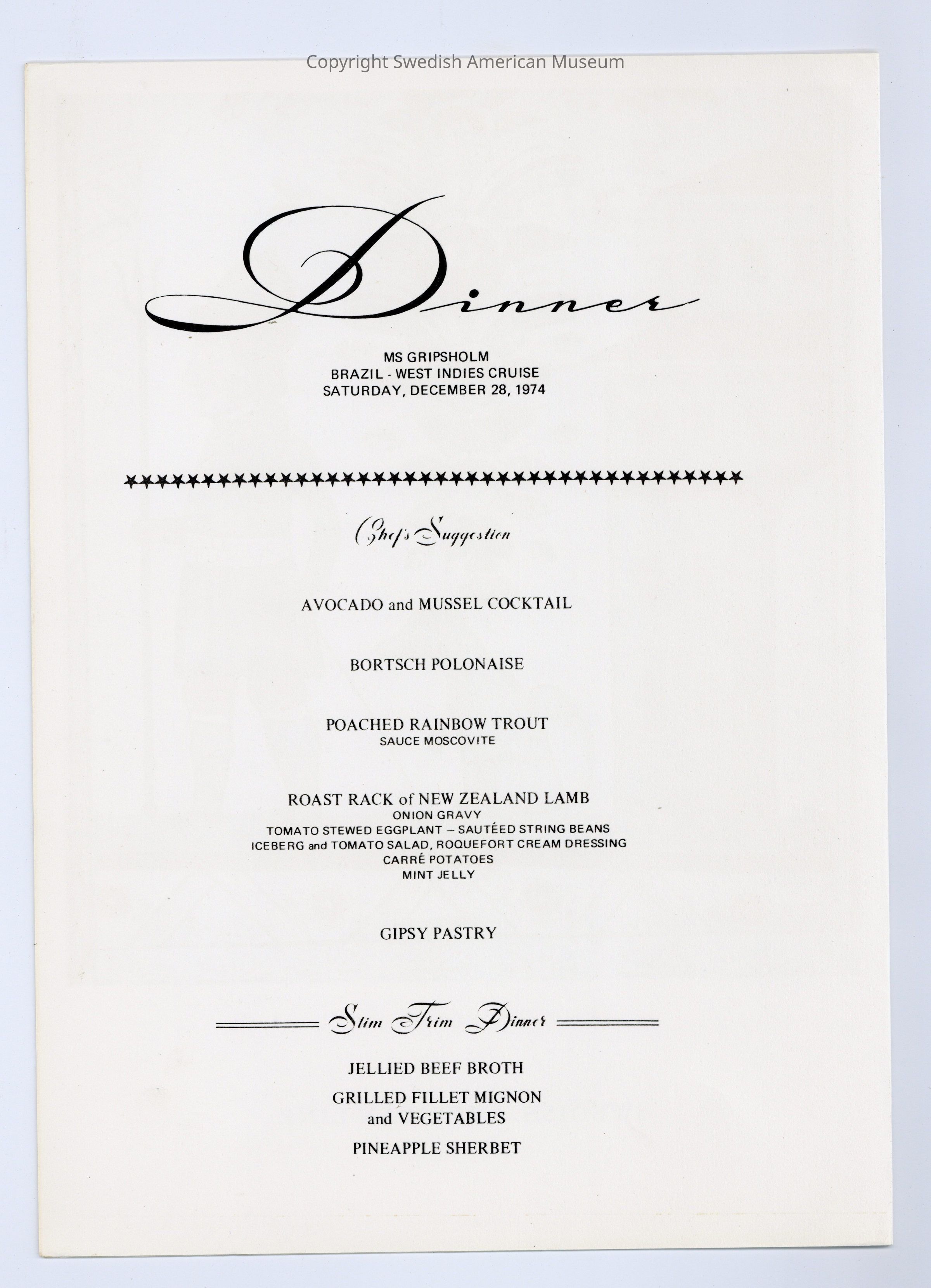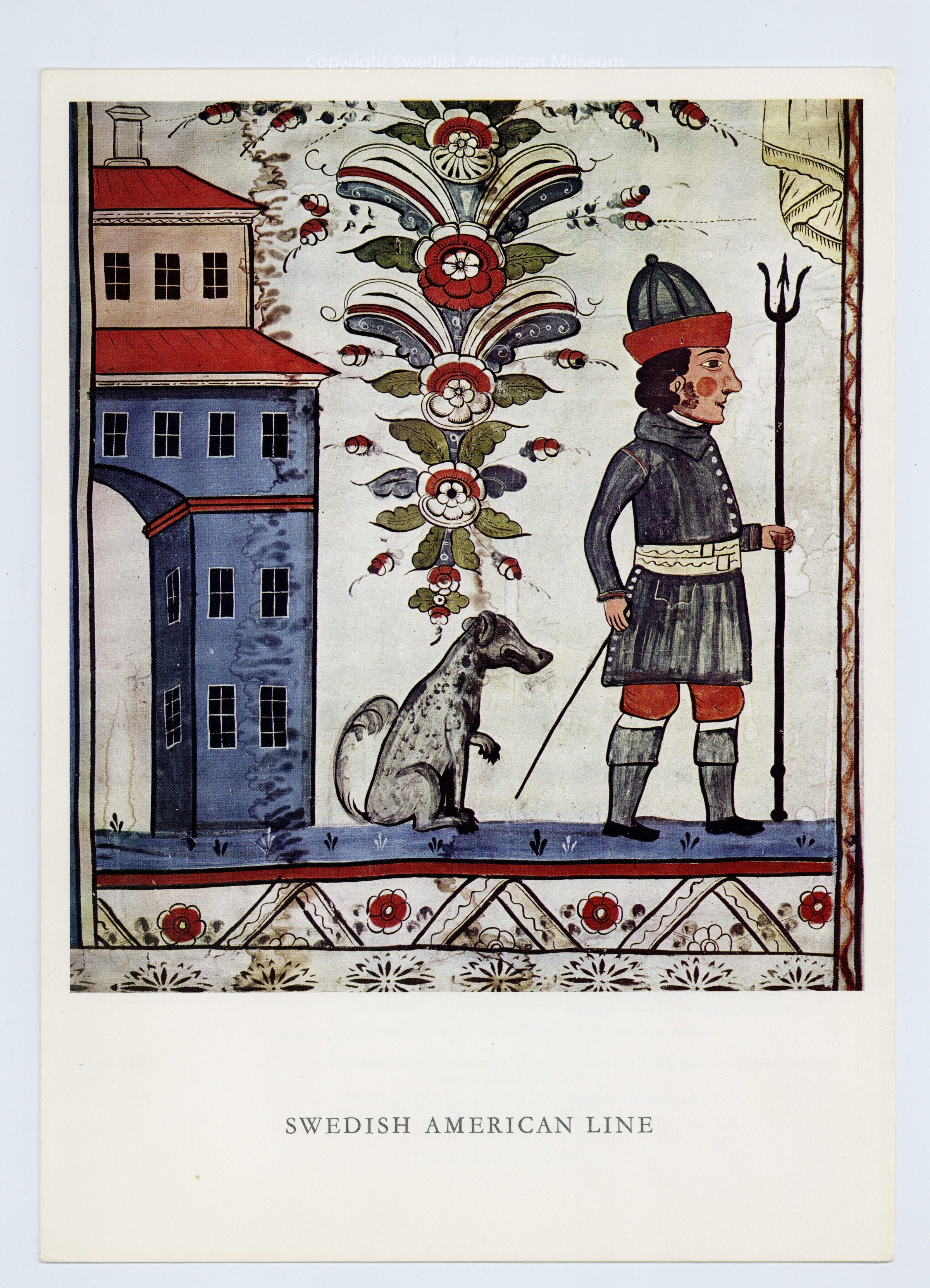 Menu for the Swedish American Line ship M.S. Gripsholm. Dinner menu with a dalmålning or bonad style art "The Doorkeeper."