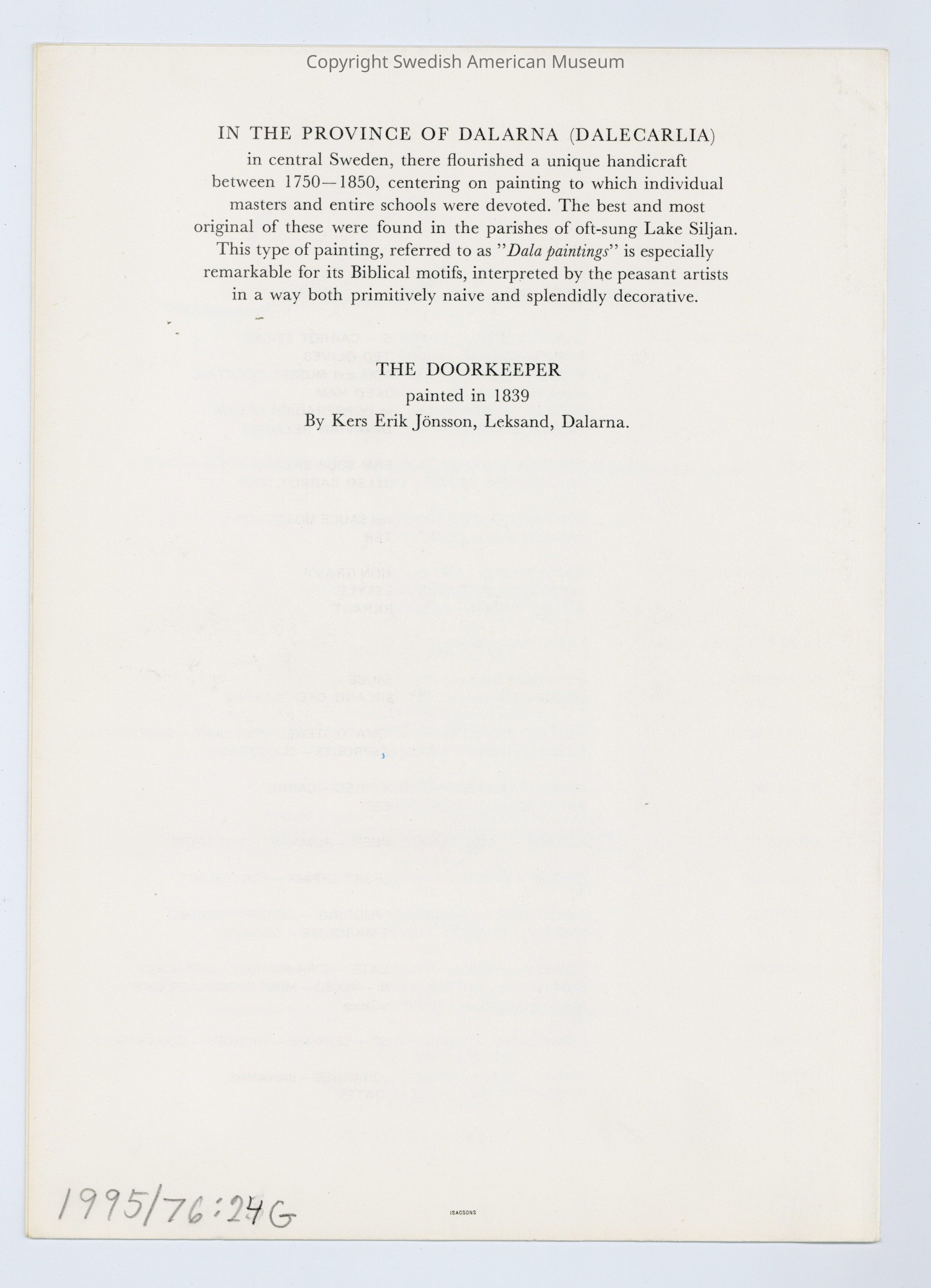 Ownership was legally transferred to the Swedish American Museum per the gift agreement. Certain works may be protected by copyright not governed by the Swedish American Museum.