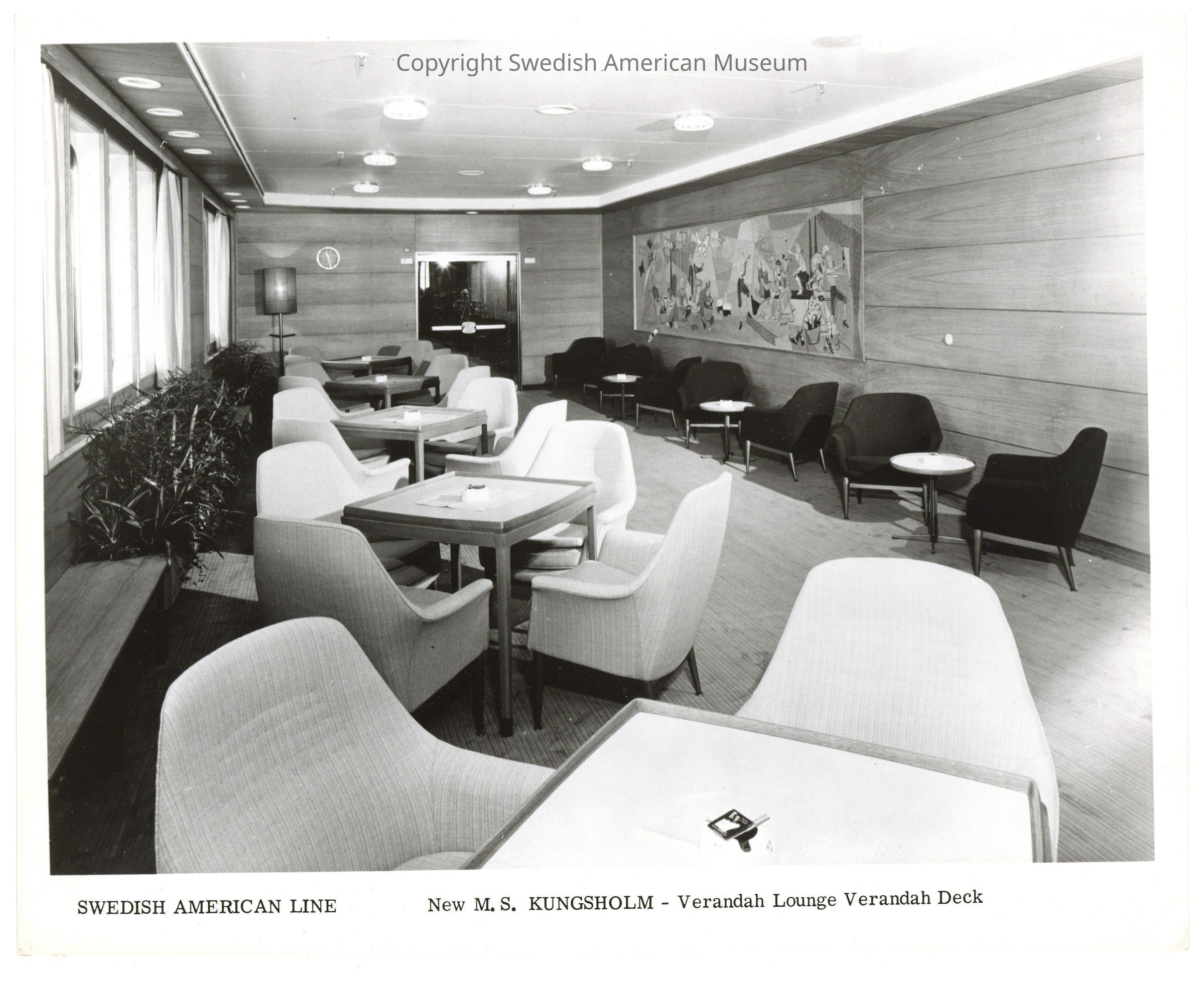 Black-and-white photograph of the Swedish American Line ship MS Kungsholm - Verandah Lounge - Verandah Deck. Chairs and tables are lined up against the walls. There is no one in the room.Photograph Details