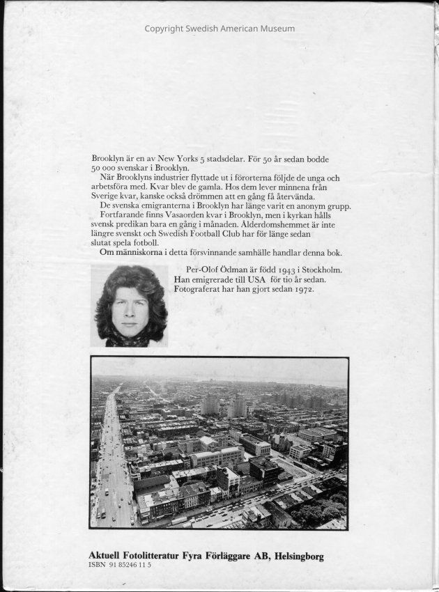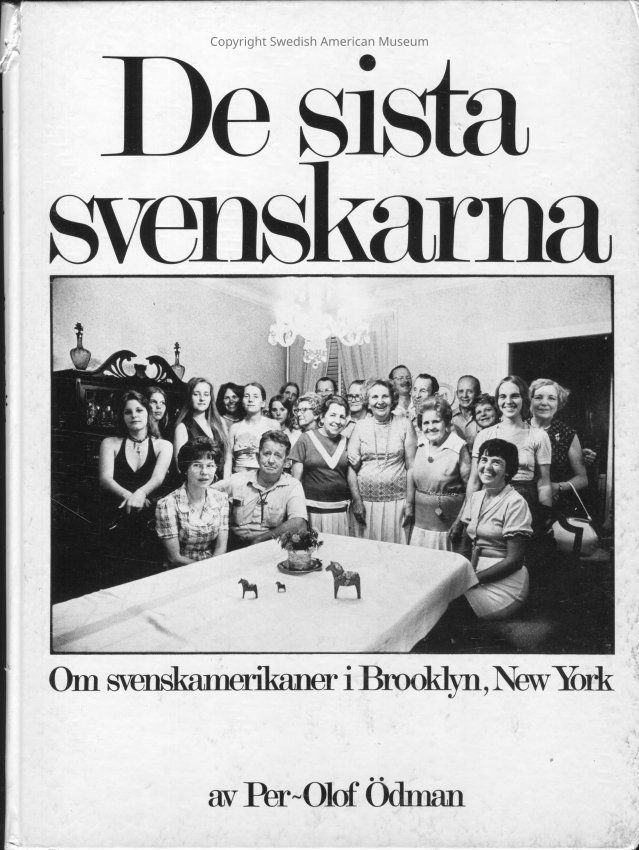Hardcover book titled "De sista svenskarna, om svenskamerikanerna i Brooklyn, New York" (Translated by author: The Last Swedes, about Swedish-Americans in Brooklyn, New York). The book features interviews and photographs of Swedish-Americans taken by donor Per-Olof Ödman in Bay Ridge in 1974-1975. There are 115 photographs in the 110-page long book. The photographs are accompanied by a descriptive text of the history of the Swedish immigrants, as well as descriptions of the photographs. The book was published in 1976 by Fyra Förläggare.Context