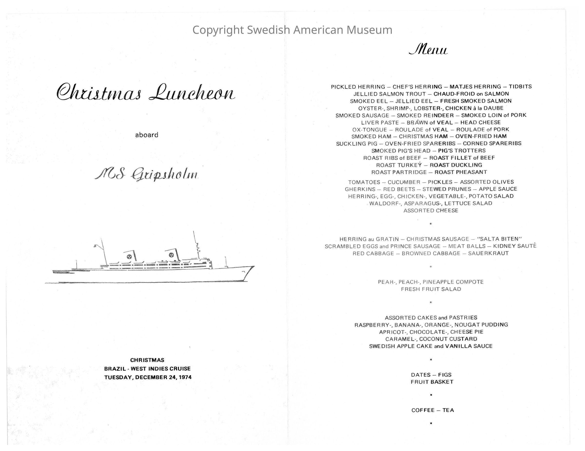 Menu from the Swedish American line "Special Holiday Series" onboard the M.S. Gripsholm - Christmas Luncheon for the "Brazil--West Indies Cruise." The cover features the painting "Christmas Eve" by Carl Larsson.