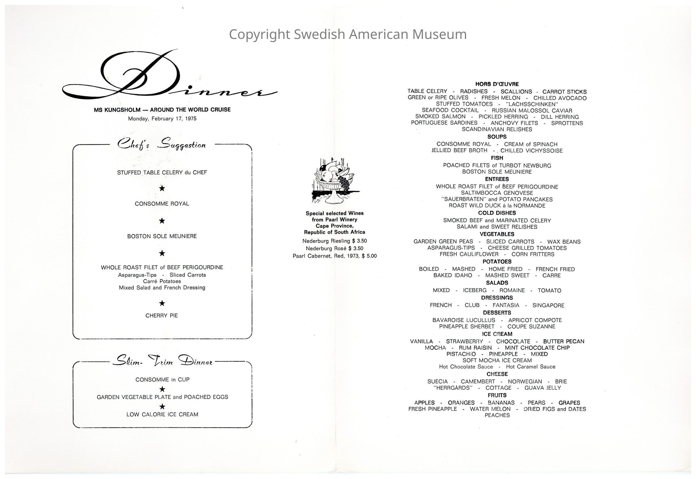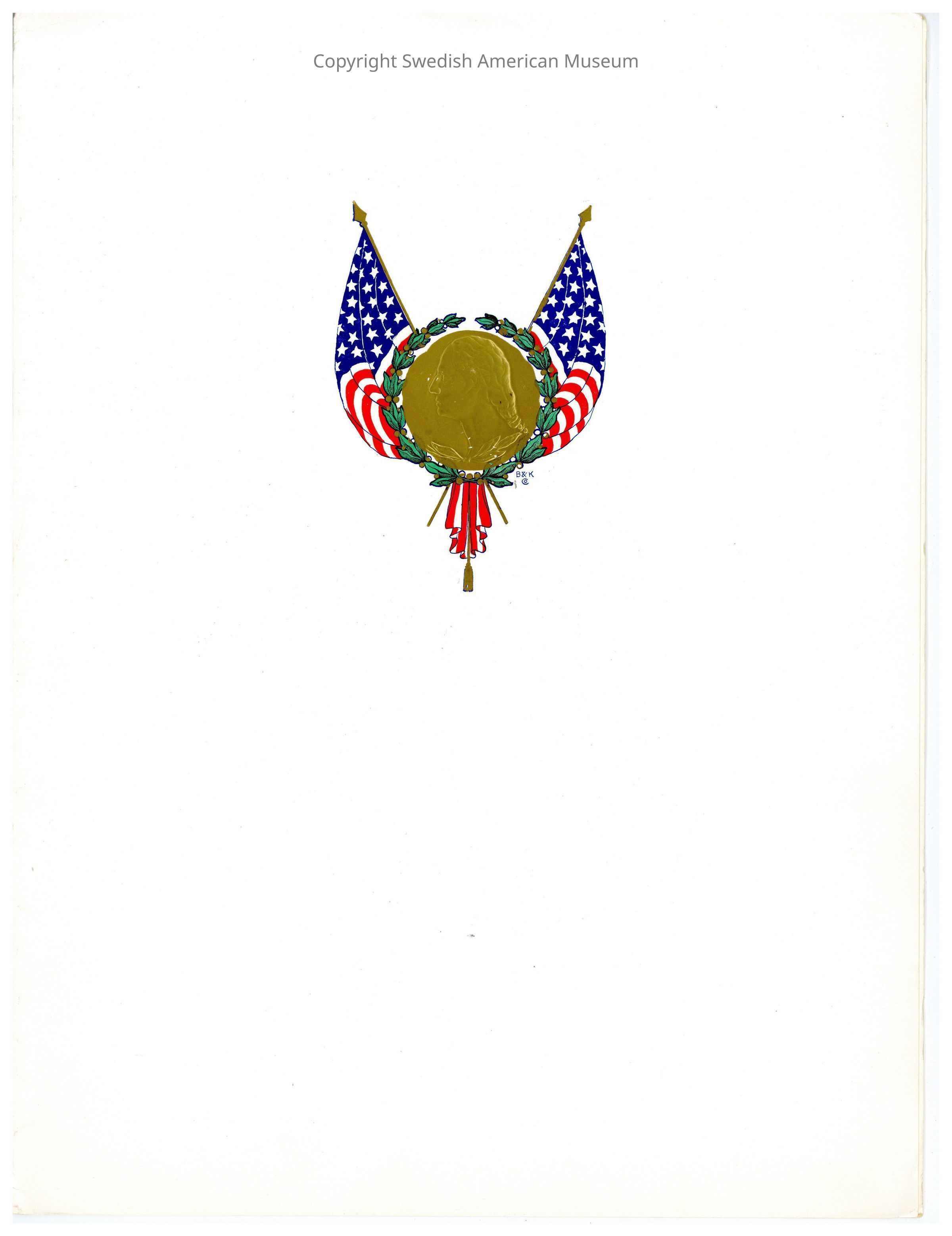 Menu from the Swedish American line "Special Holiday Series" onboard the M.S. Kungsholm - President's Day. The menu is white with a gold medallion and two American flags and a laurel illustration on the front.Context