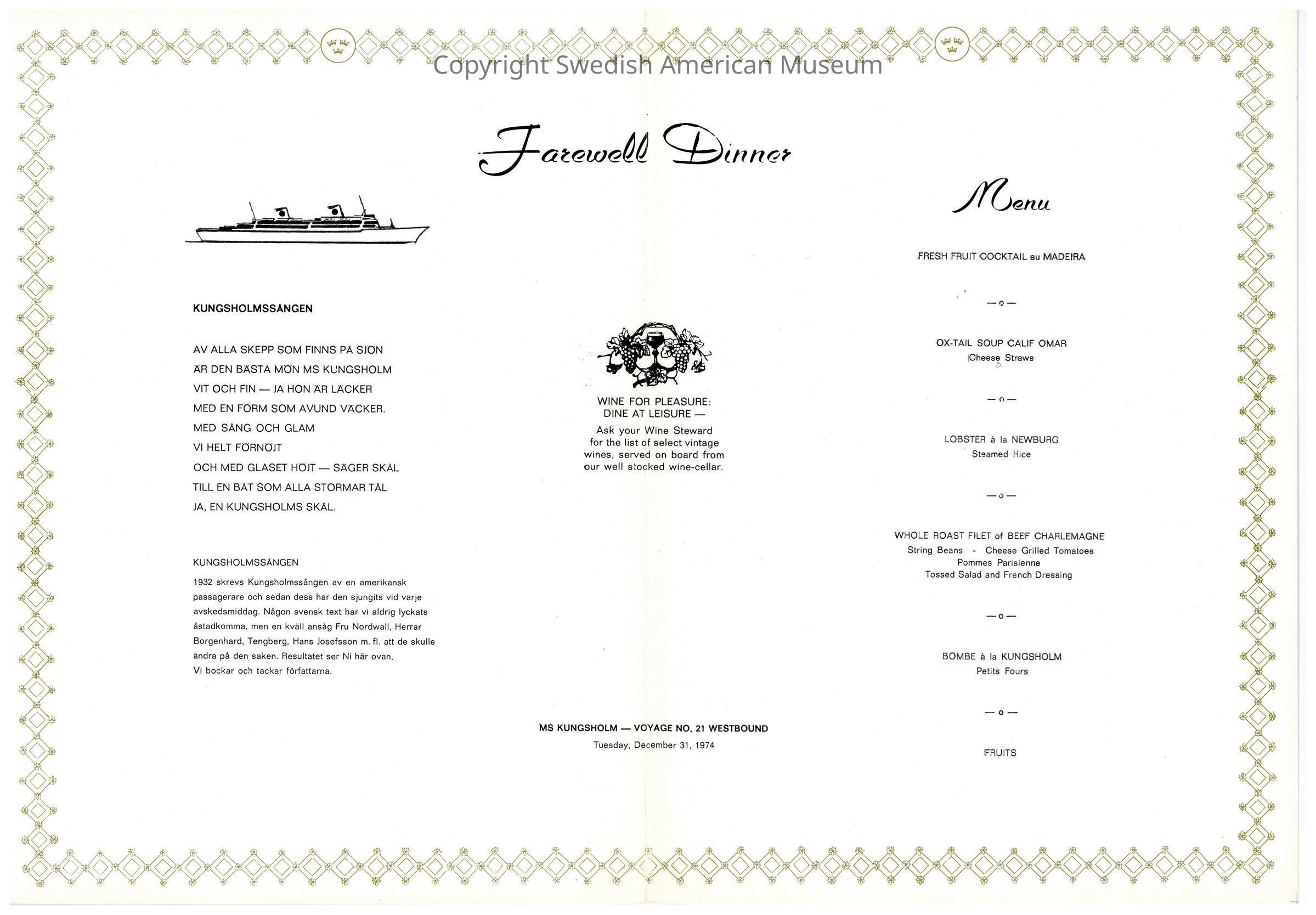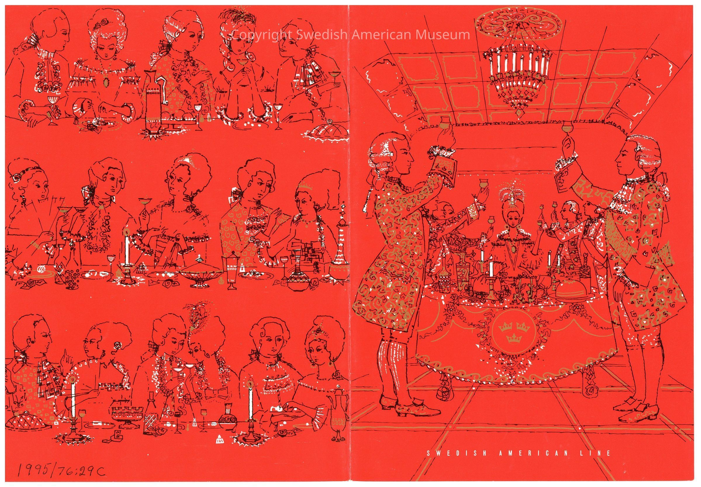 Menu from the Swedish American line "Special Holiday Series" onboard the M.S. Kungsholm - New Year's Eve Farewell Dinner. Cover is red with illustrations in black ink with white and gold accents. The front cover has a dining scene with a table in the center with a woman in a gown and fancy gentlemen flanked on each side with glasses raised in a toast. The back features a pattern of groups of people dining.Context