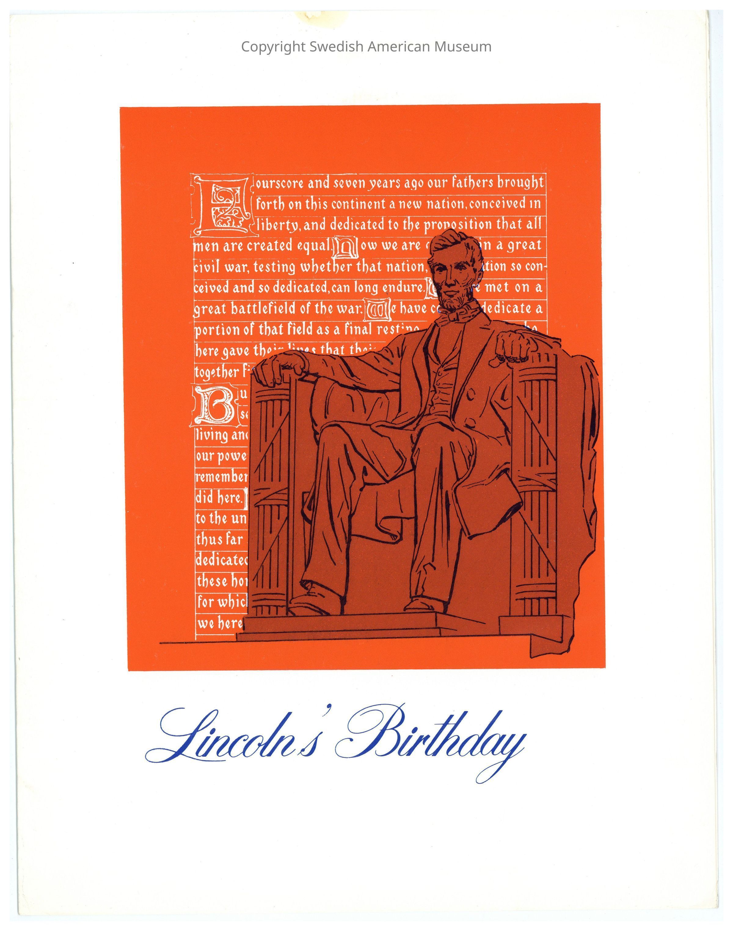 Menu from the Swedish American line "Special Holiday Series" onboard the M.S. Kungsholm - Lincoln's Birthday. The cover has an orange square with an illustration of the Lincoln memorial with the Emancipation Proclamation written in white in the background.Context