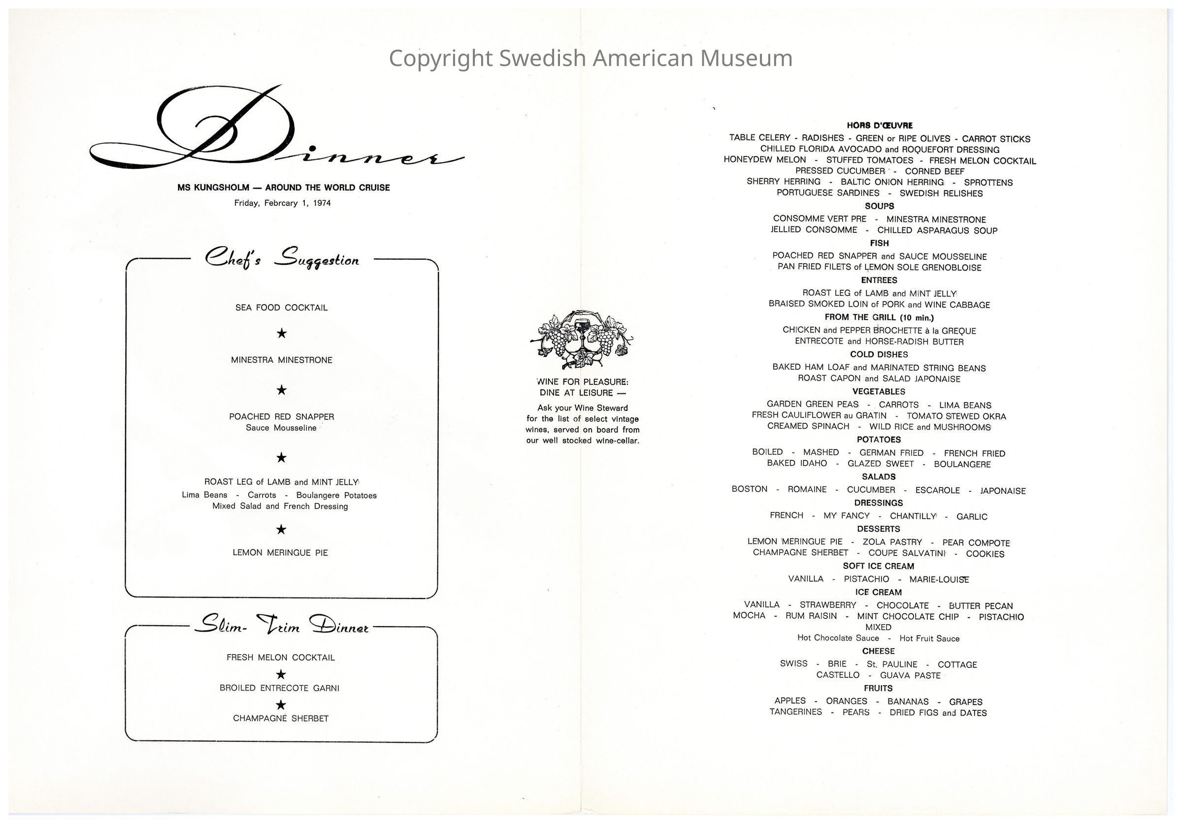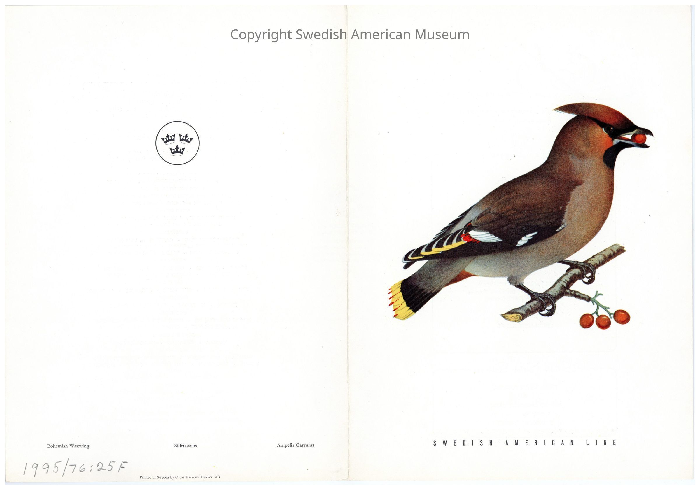 Menu from the Swedish American line onboard the M.S. Kungsholm. Dinner menu with "Bohemian Waxwing" bird motif.Context
