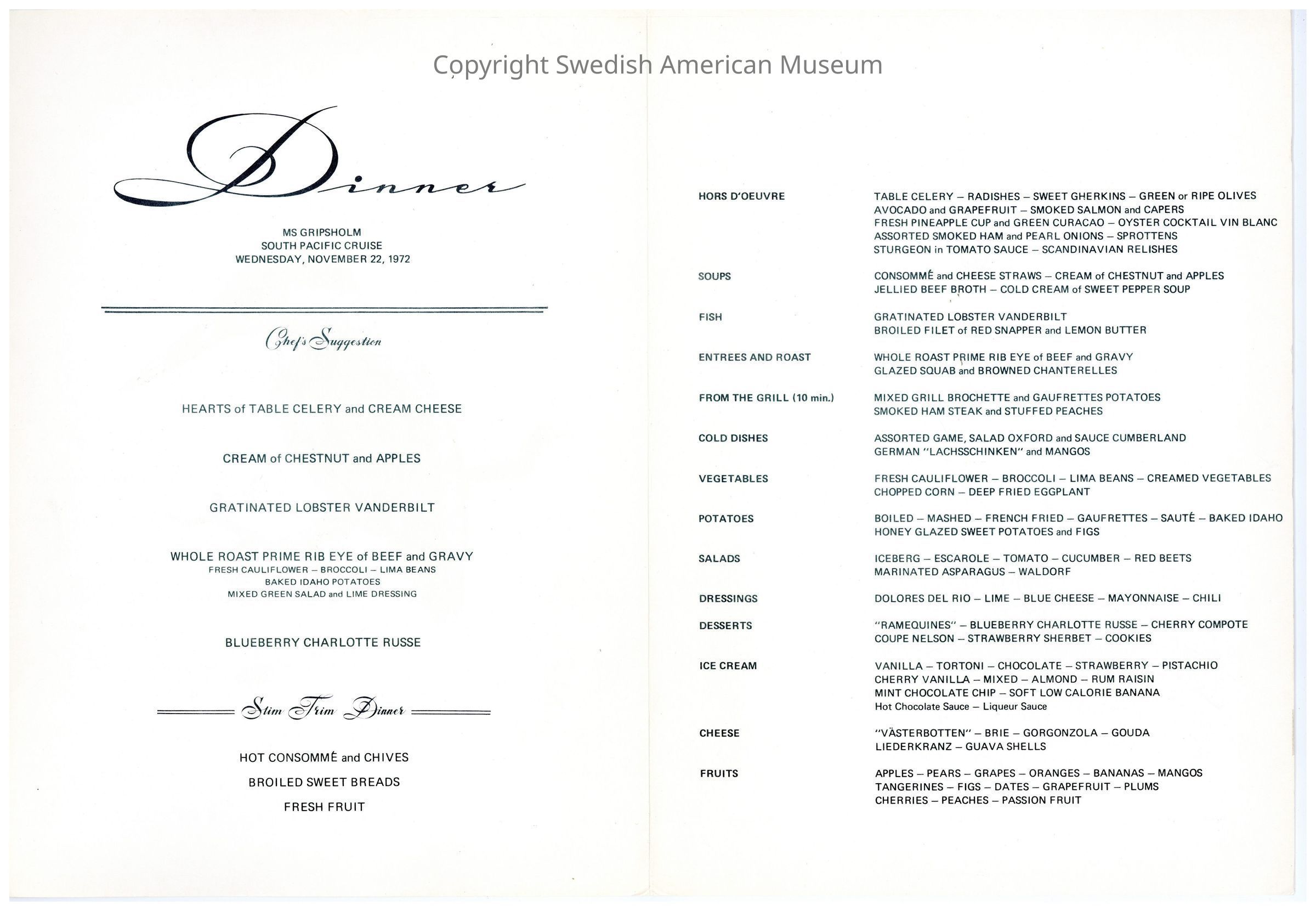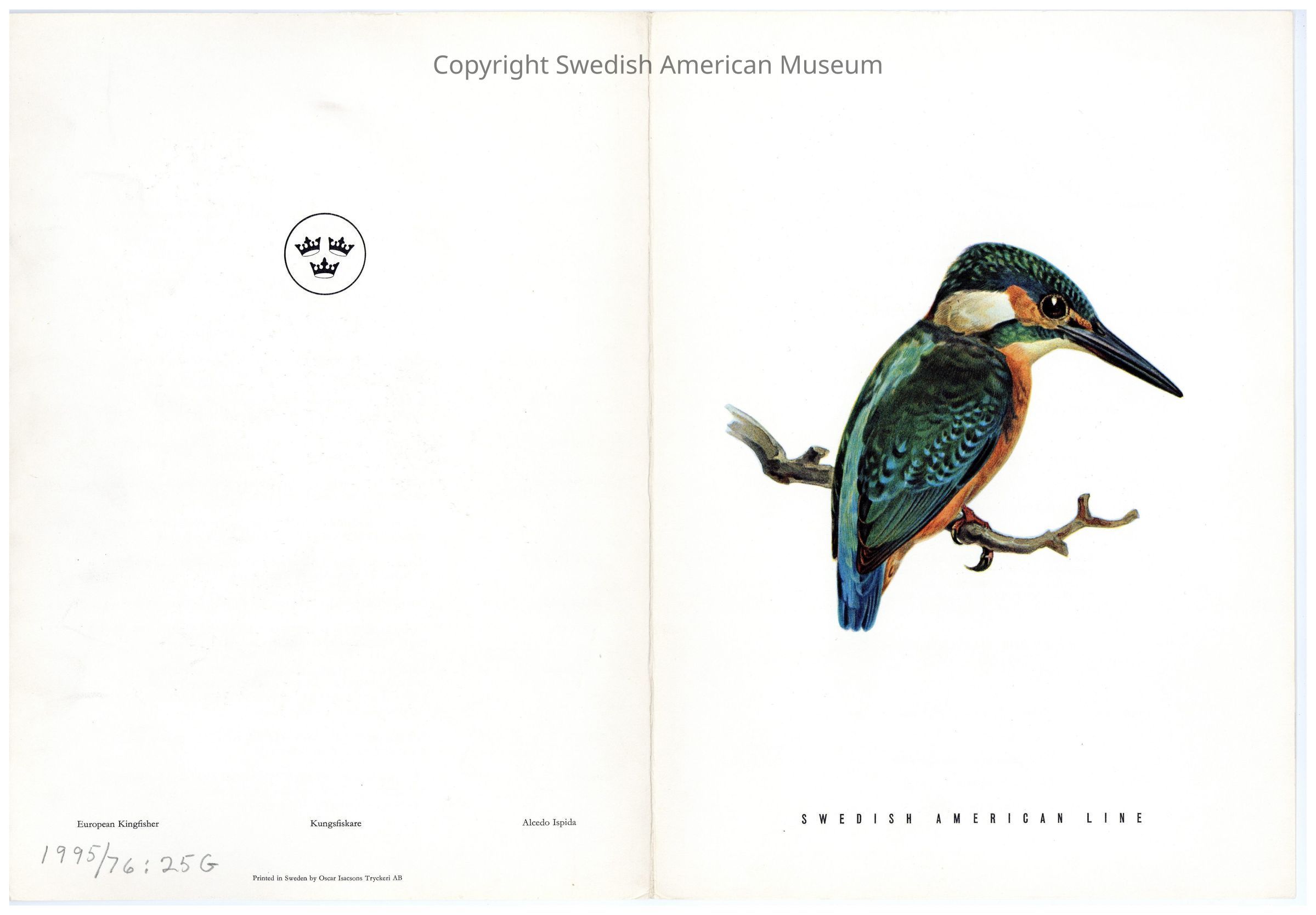 Menu from the Swedish American line onboard the M.S. Gripsholm. Dinner menu with "European Kingfisher" bird motif.Context
