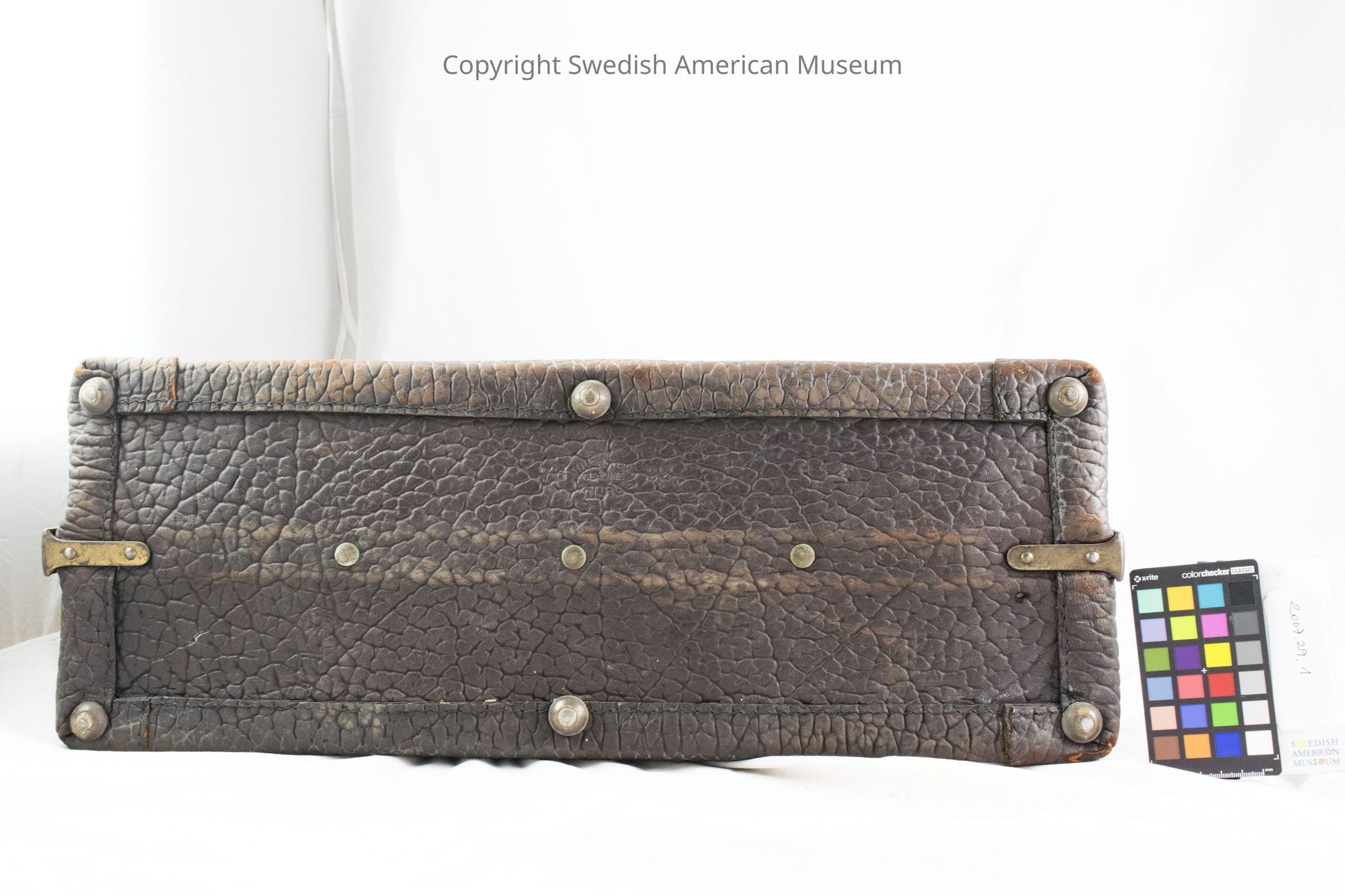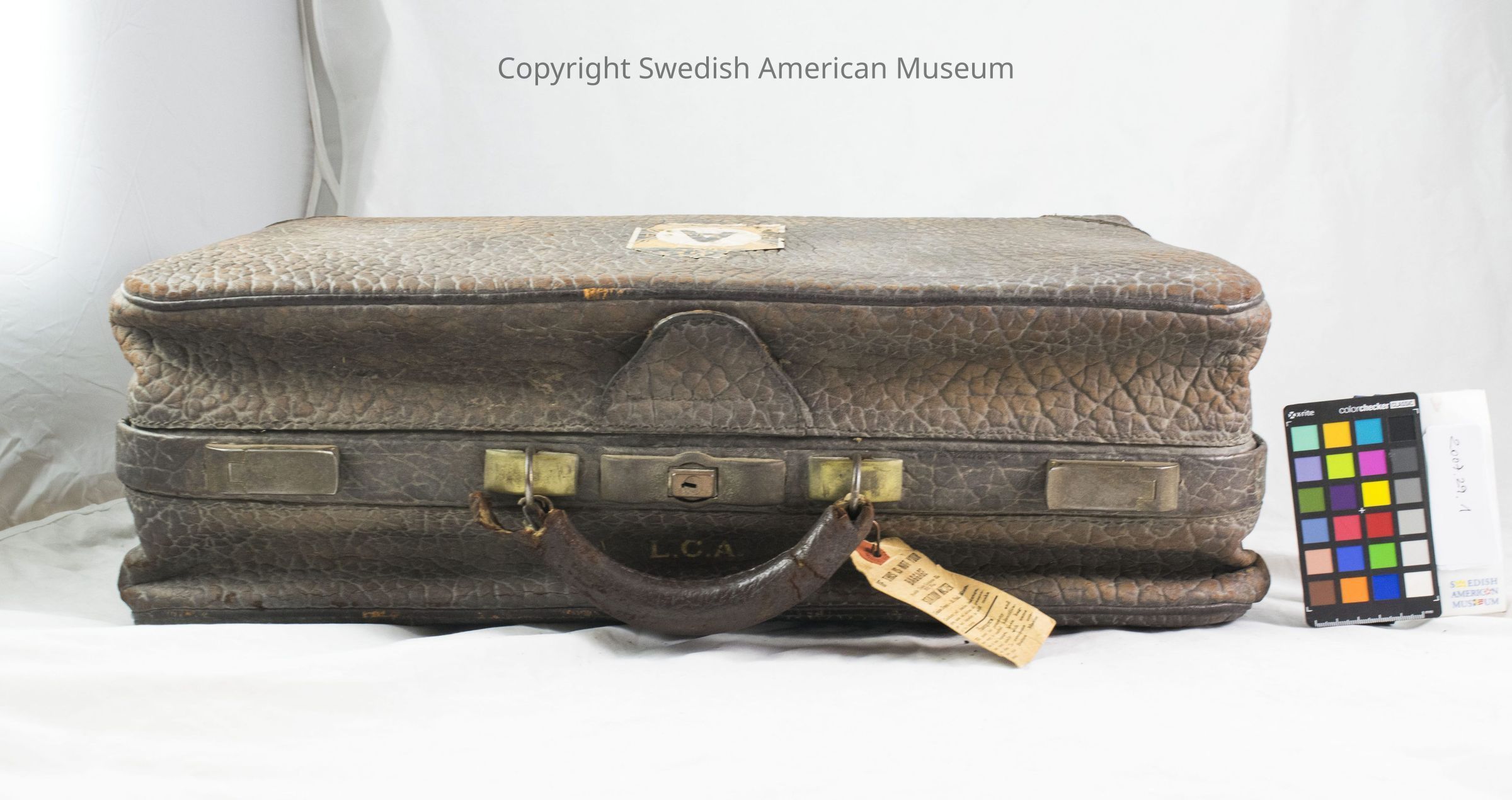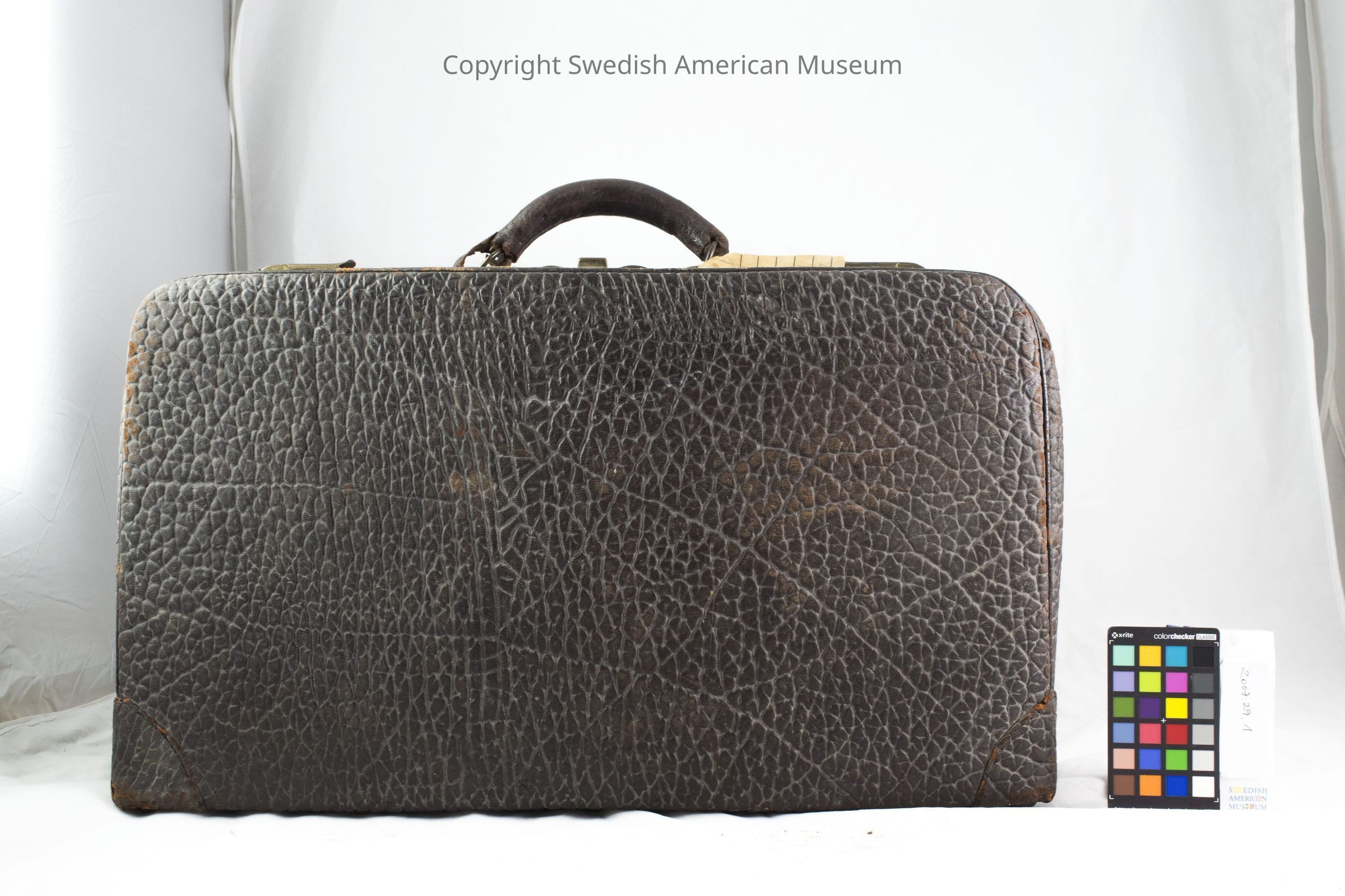 Dark brown leather suitcase. The leather is very rough, and a guarantee on the bottom says that the leather is walrus. Handle is attached to two brass fittings by rings and is wrapped in finer leather. There is a sticker on the front with a large "A" flanked by two anchors and underneath one can make out the words "New York to Gothenburg".