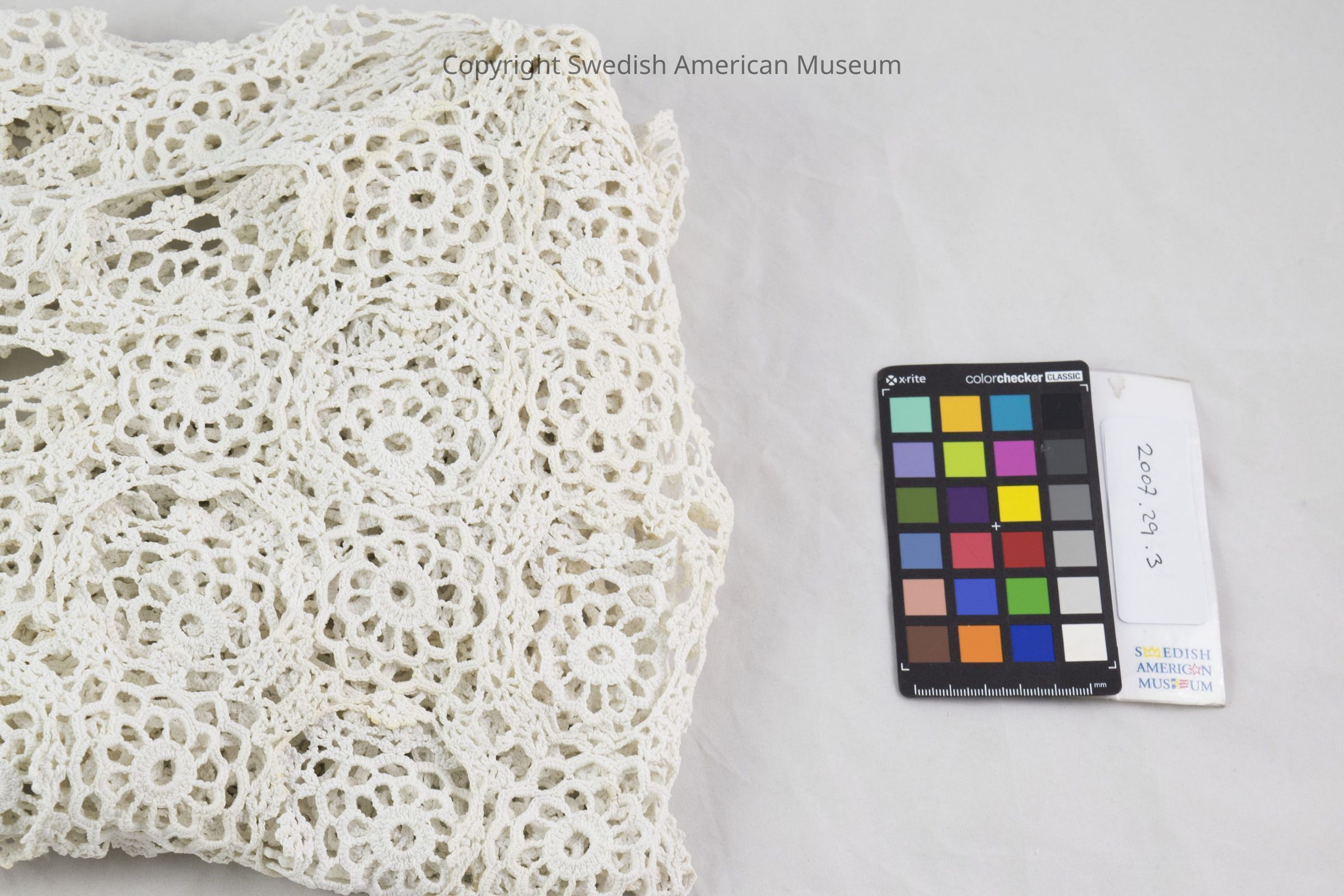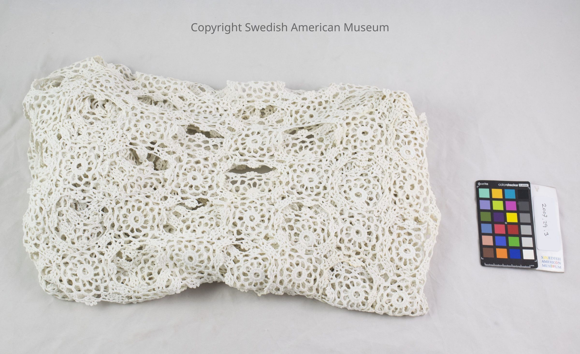 White and crocheted tablecloth. The tablecloth is decorated with cut-outs of white flowers and cut-outs of circles, diamond shapes, triangles, and trapezoids within those flowers.Acquisition