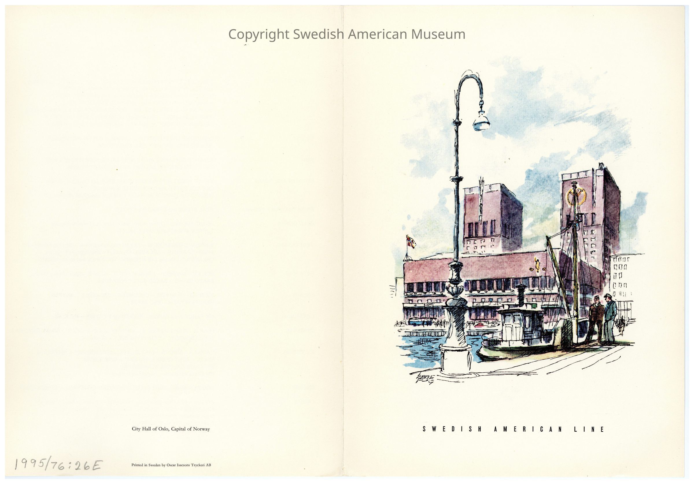 Menu from the Swedish American line onboard the M.S. Gripsholm. Dinner menu with Scandinavian cities in watercolors titled "City Hall, Oslo, Capital of Norway."Context