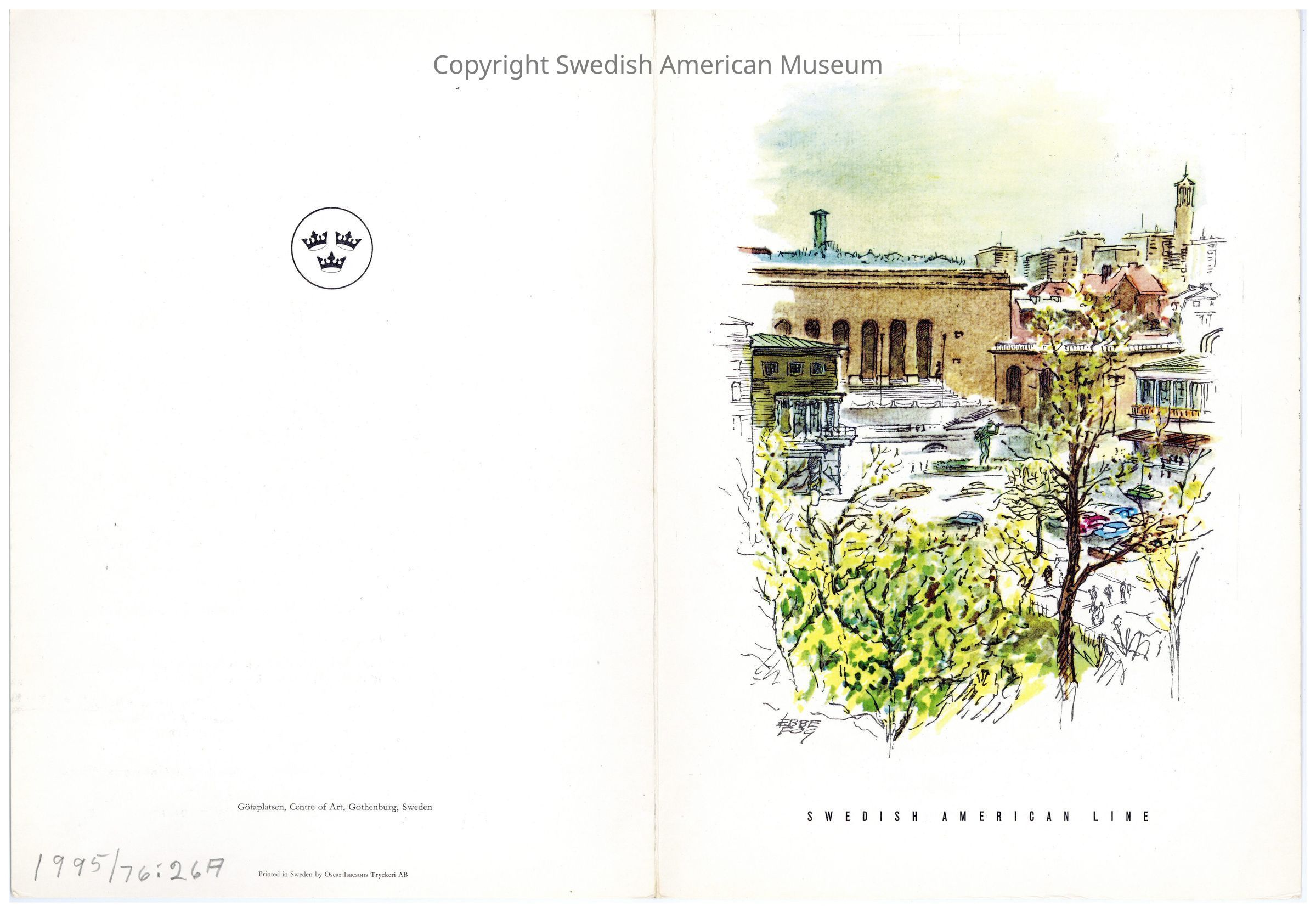 Menu from the Swedish American line onboard the M.S. Gripsholm. Dinner menu with Scandinavian cities in watercolors titled "Götaplatsen, Gothenburg, Sweden." City street scene with trees in the foreground.Context