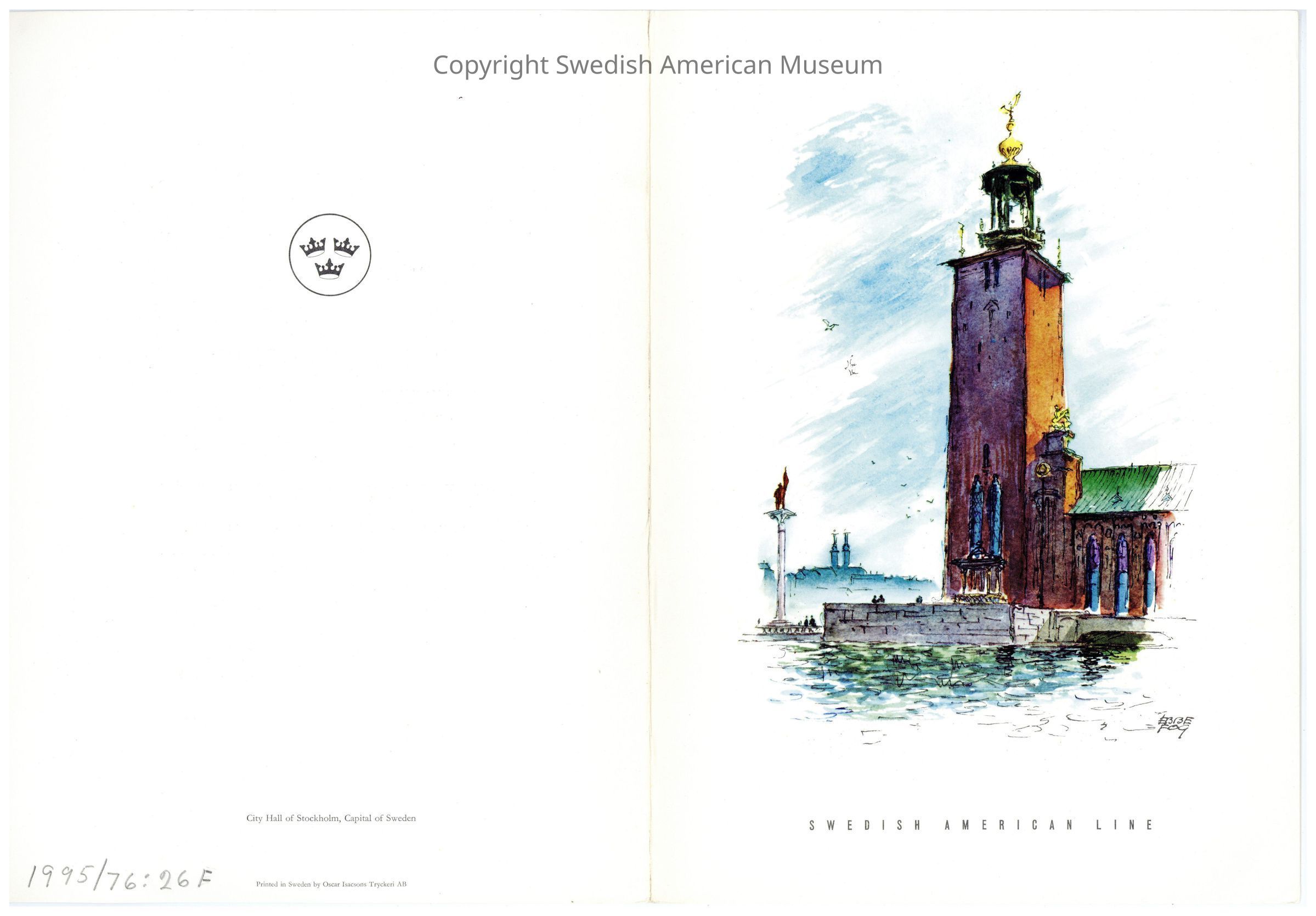 Menu from the Swedish American line onboard the M.S. Kungsholm. Dinner menu with Scandinavian cities in watercolors titled "City Hall of Stockholm, Capital of Sweden." The image features a tall building overlooking some water.Context