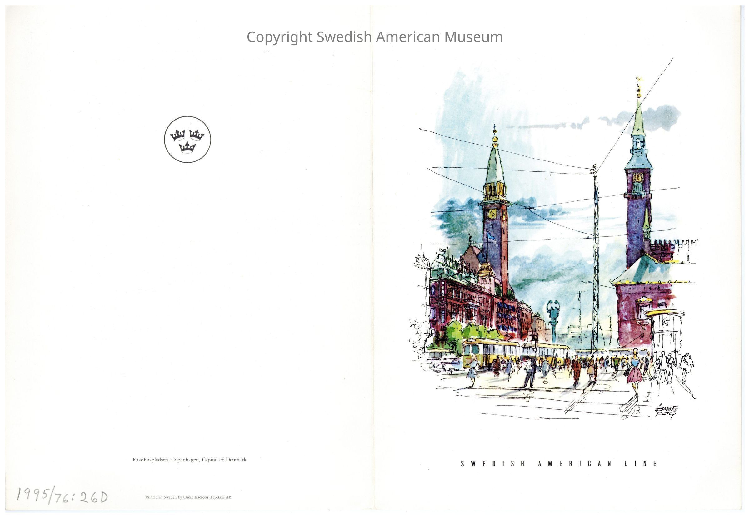 Menu from the Swedish American line onboard the M.S. Kungsholm. Dinner menu with Scandinavian cities in watercolors titled "Raadhusplatsen, Copenhagen, Capital of Denmark." Front cover shows a streetview of the city, with buildings and trollies and people walking around.Context