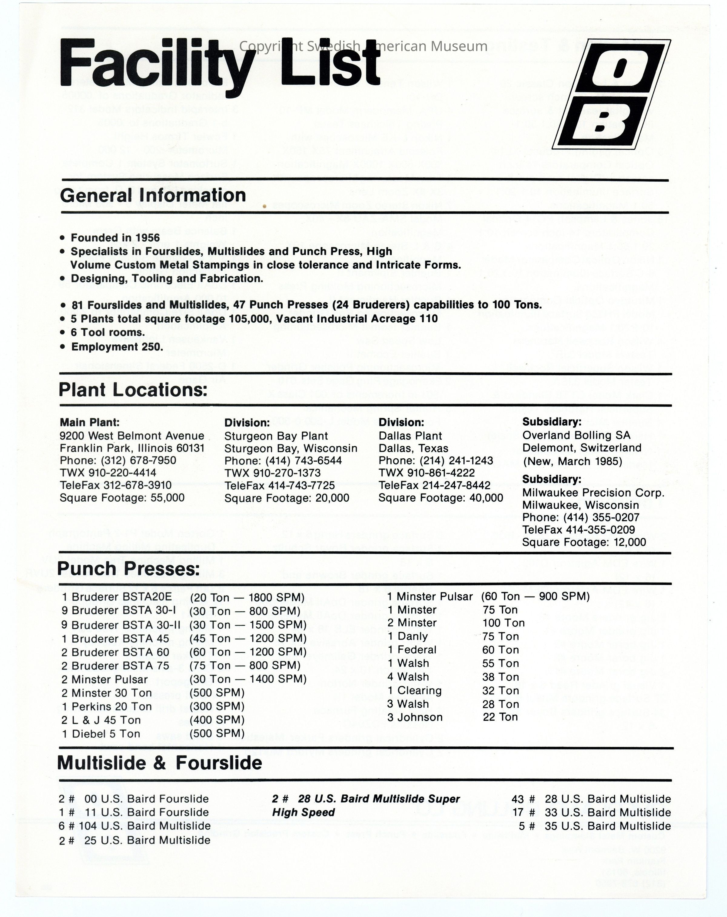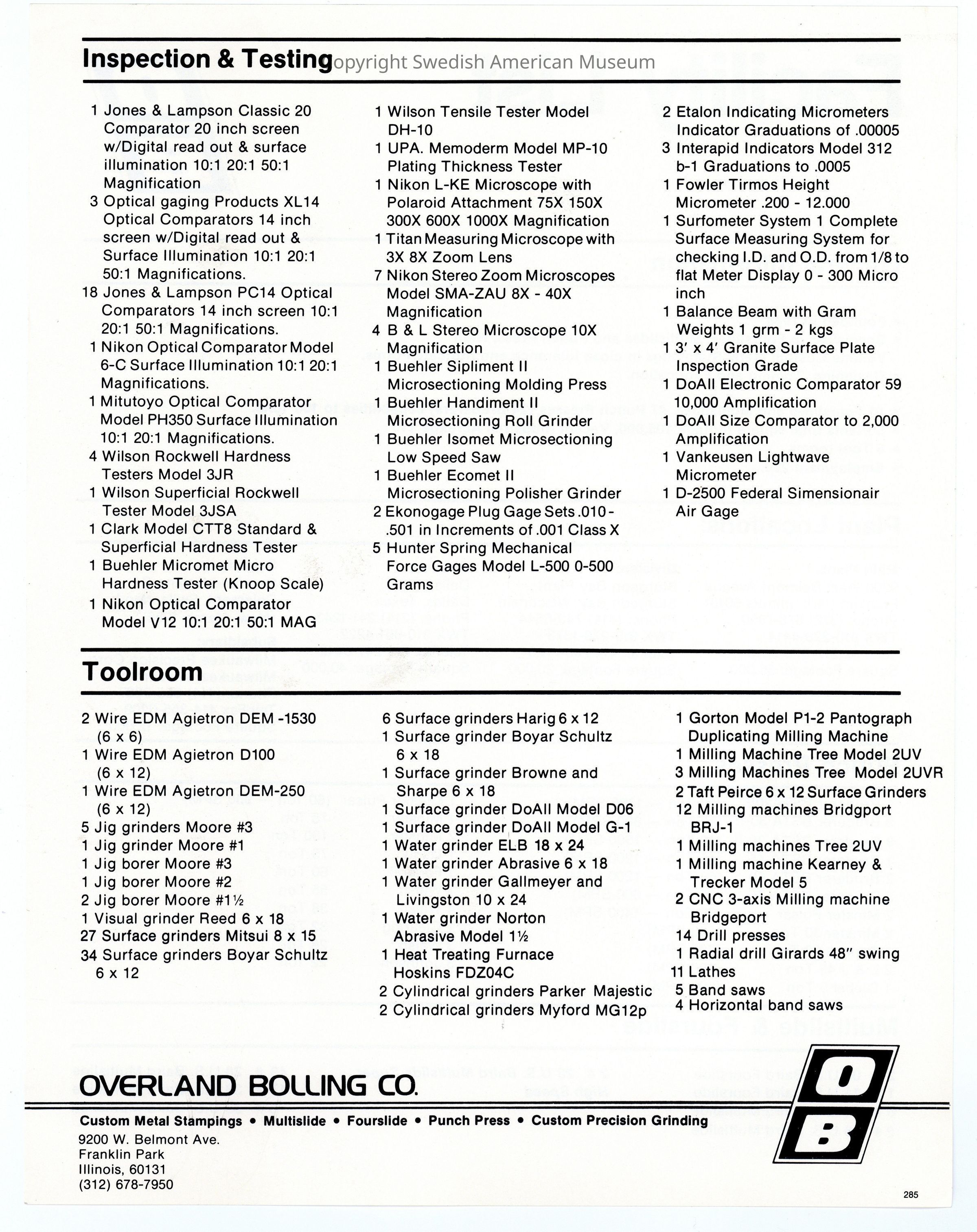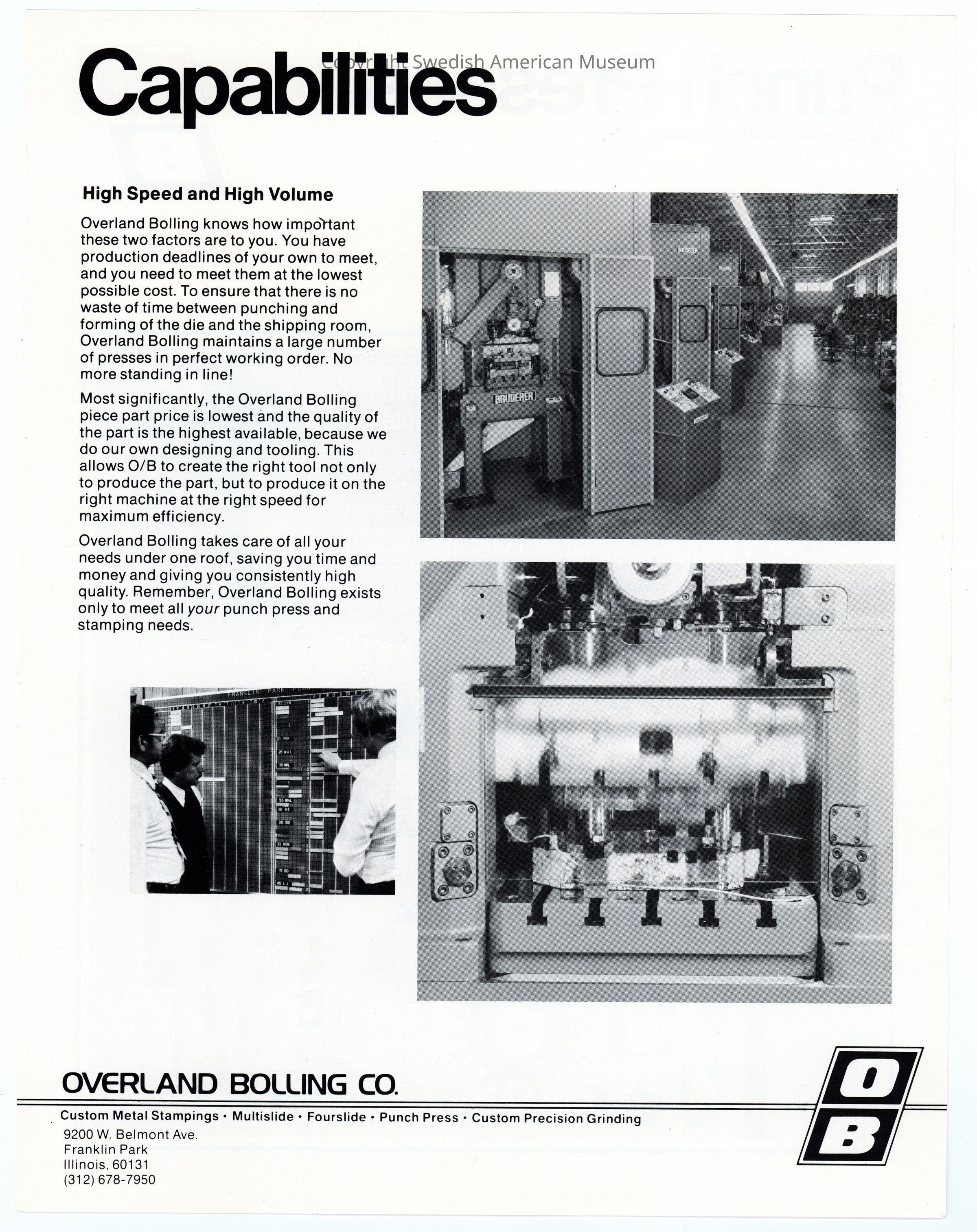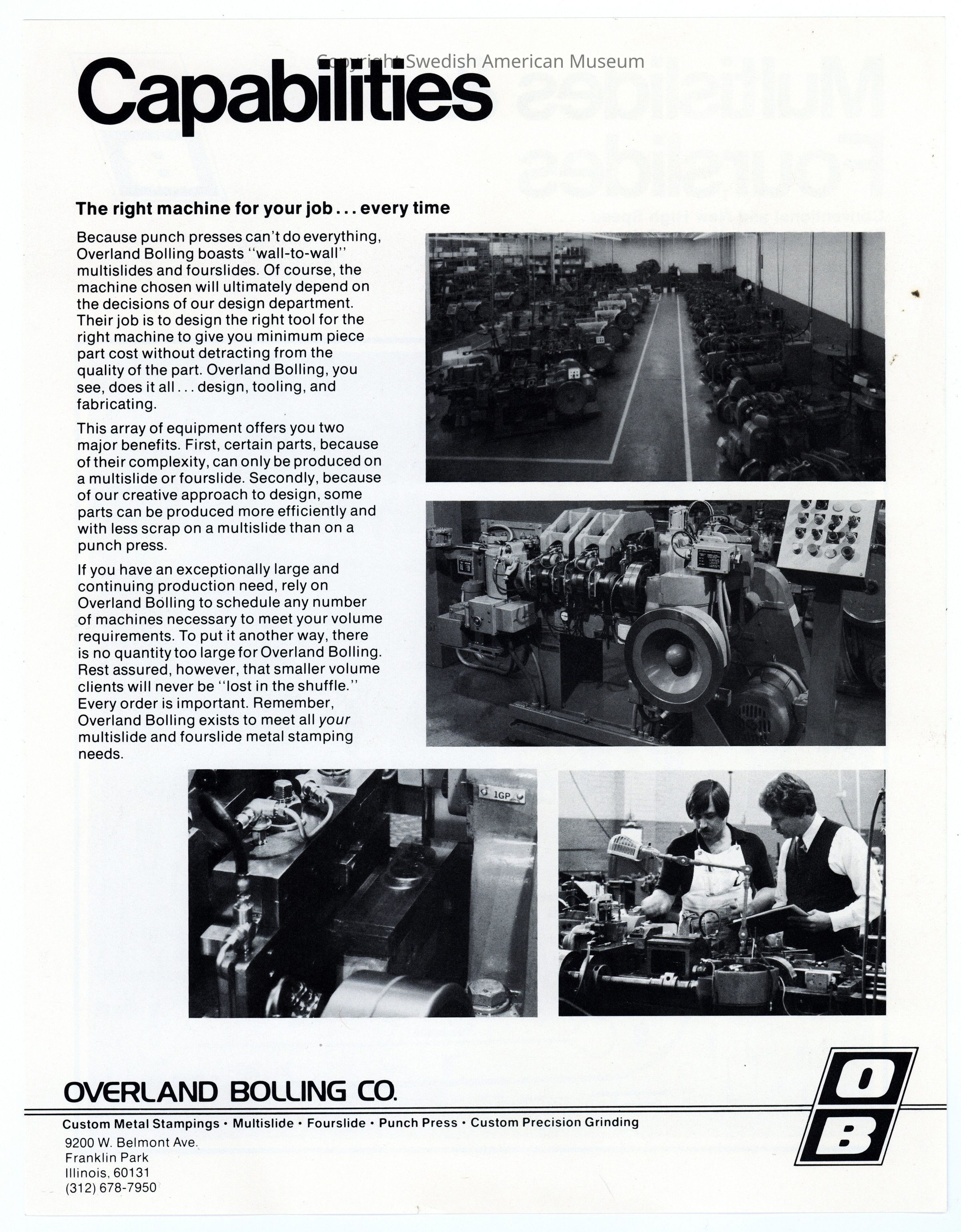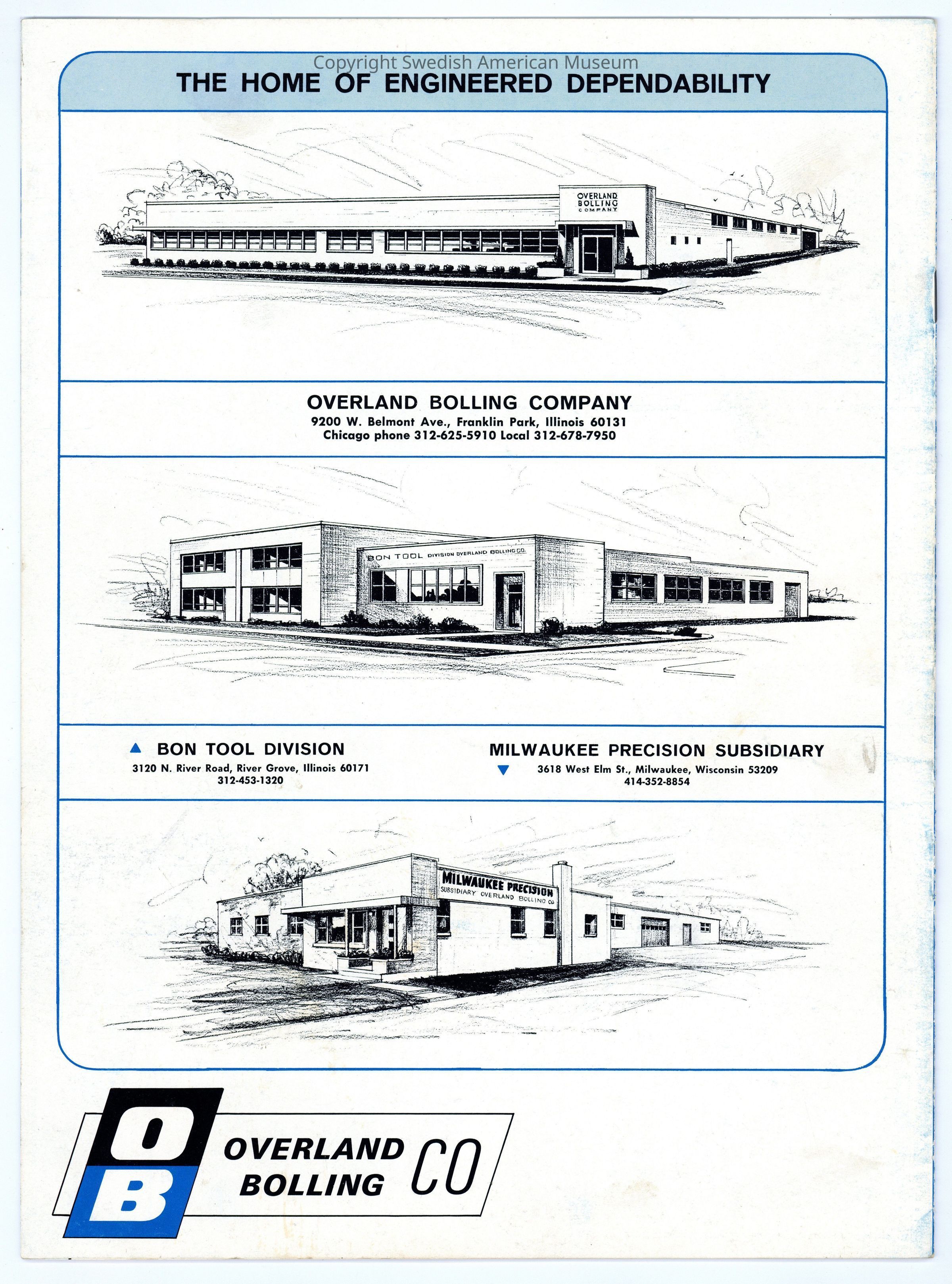 A collection of publications from Overland Bolling Co. on their history and business. The company was founded in 1956 and specialized in metal stamping, precision grinding, and tools. Bon Tool and Milwaukee Precision were divisions of the company.Context