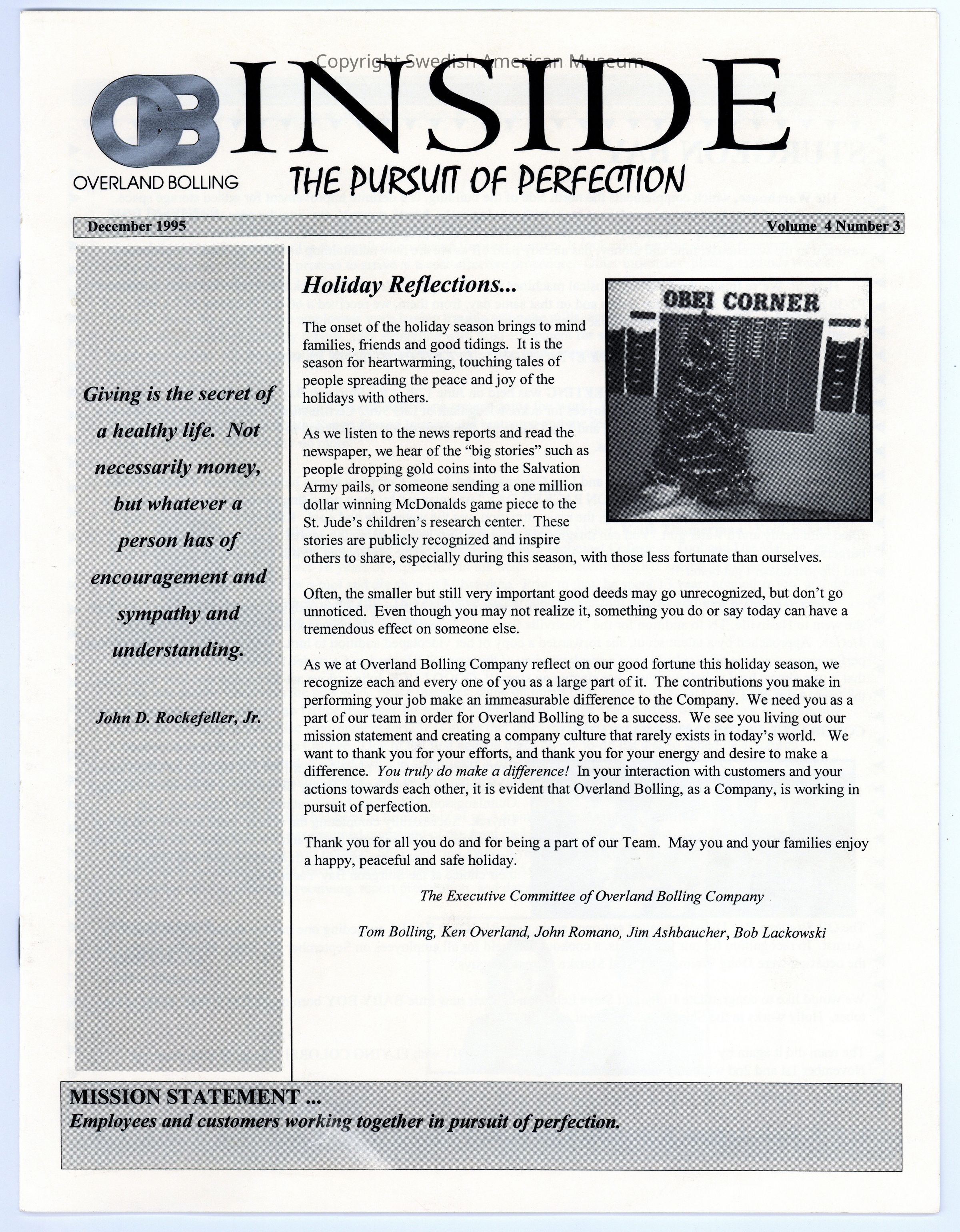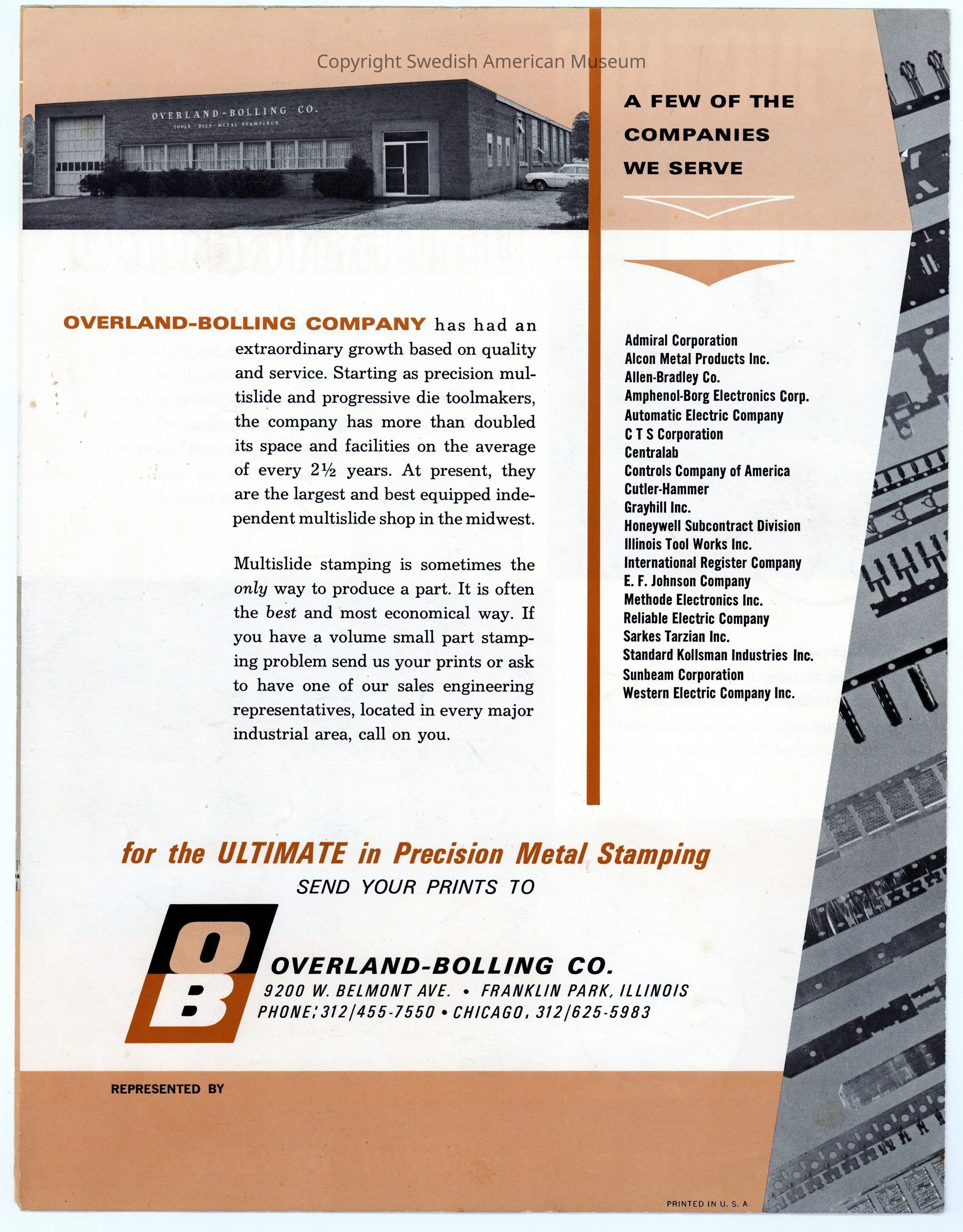 At the age of ten, Pehr Bolling immigrated to Chicago from Mariestad, Sweden to join his family in the pursuit of work and opportunity. In Chicago, he served as an apprentice at Mill Industries for tools and die. As an apprentice, he struck up a friendship with Karl Overland and Kenneth Allison, who he founded Overland Bolling with him in 1956. Additionally, Pehr Bolling, a designer in trade, spent many hours creating different designs like the B-Wire Connector that launched the business. This highly respectable precision metal stamp company had a vision of a company fueled by people with integrity and strong work habits. As a result, they became a staple in the tools and die industry, making parts of planes and ultra-precise components for the aircraft, electrical, and electronic industries. After their small operation in Hinsdale, Illinois took off; they were able to expand to other parts of the country, creating a factory all the way in Switzerland. Similar to many Swedish businesses at the time, Pehr Bolling’s son, Thomas, took over as president, keeping the business in the family and the Bolling name intact.Acquisition