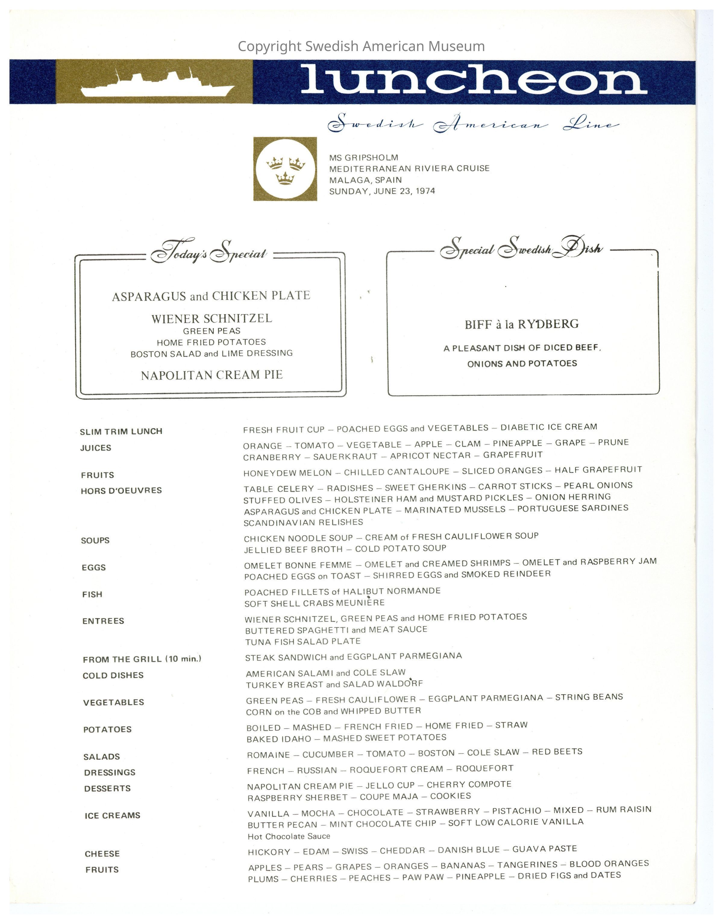 Menu from the Swedish American line onboard the M.S. Gripsholm. Luncheon menu. Printed on a single sheet of cardstock paper. Blue and gold banner title with a white silhouette of a ship.Context