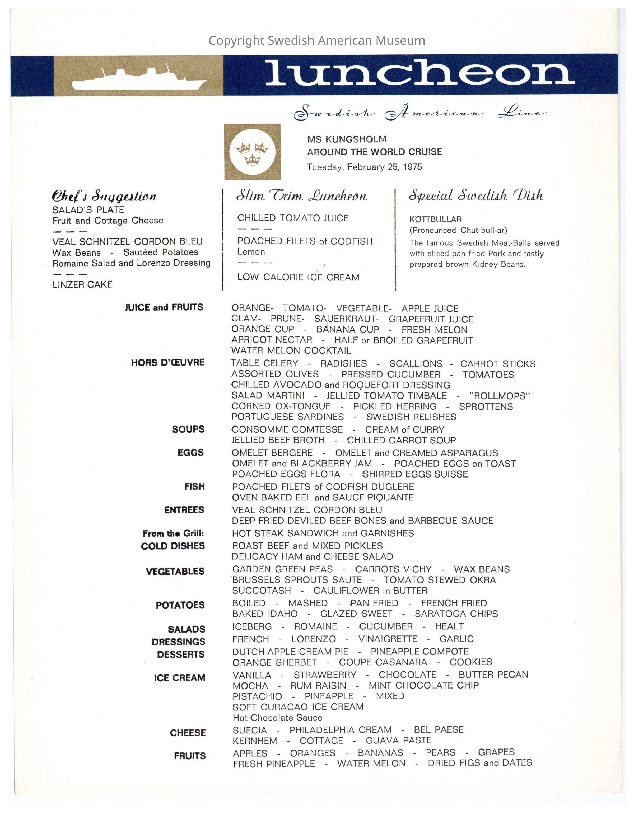 Menu from the Swedish American line onboard the M.S. Gripsholm. Luncheon menu. Printed on a single sheet of cardstock paper. Blue and gold banner title with a white silhouette of a ship.Context