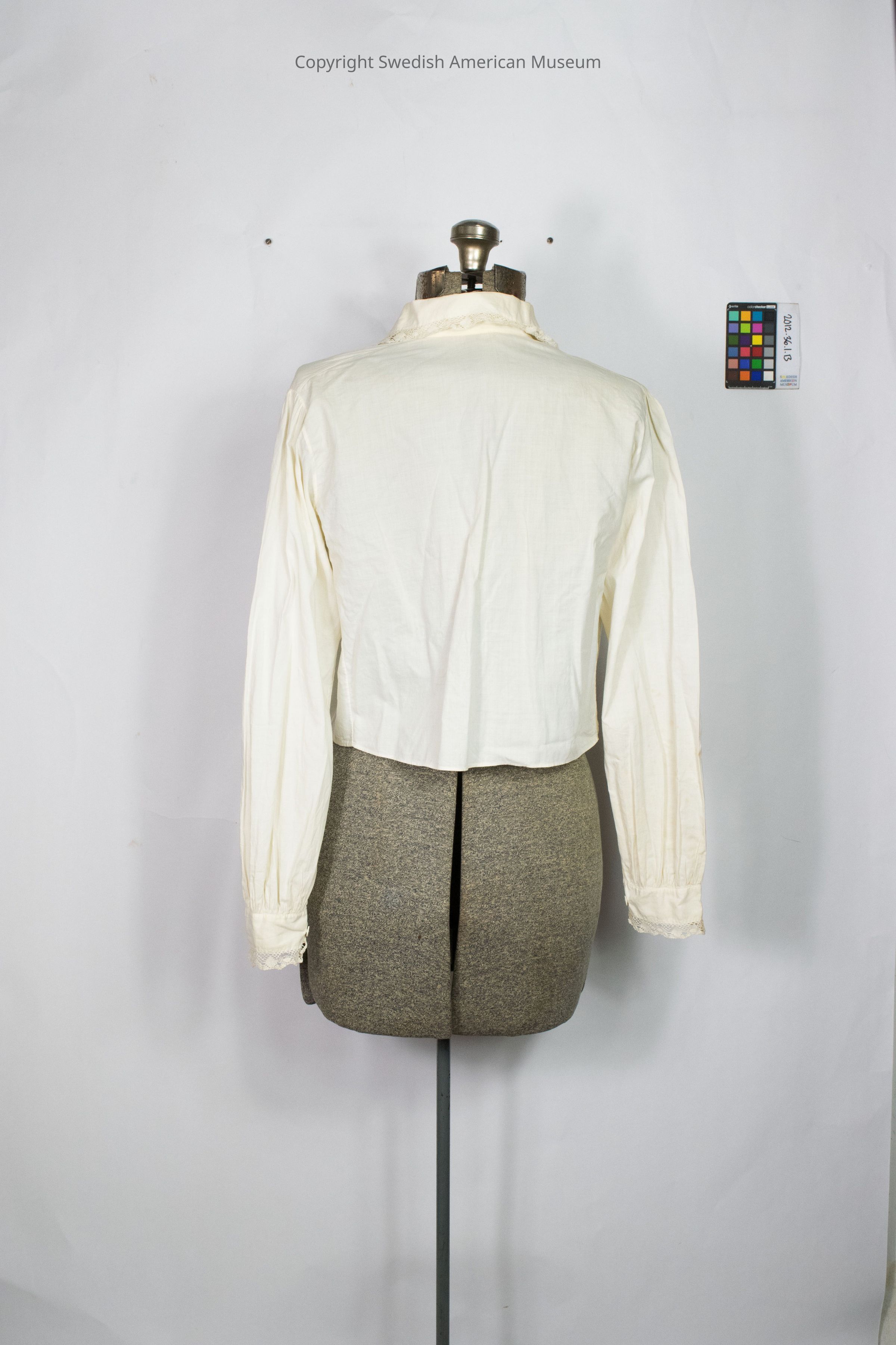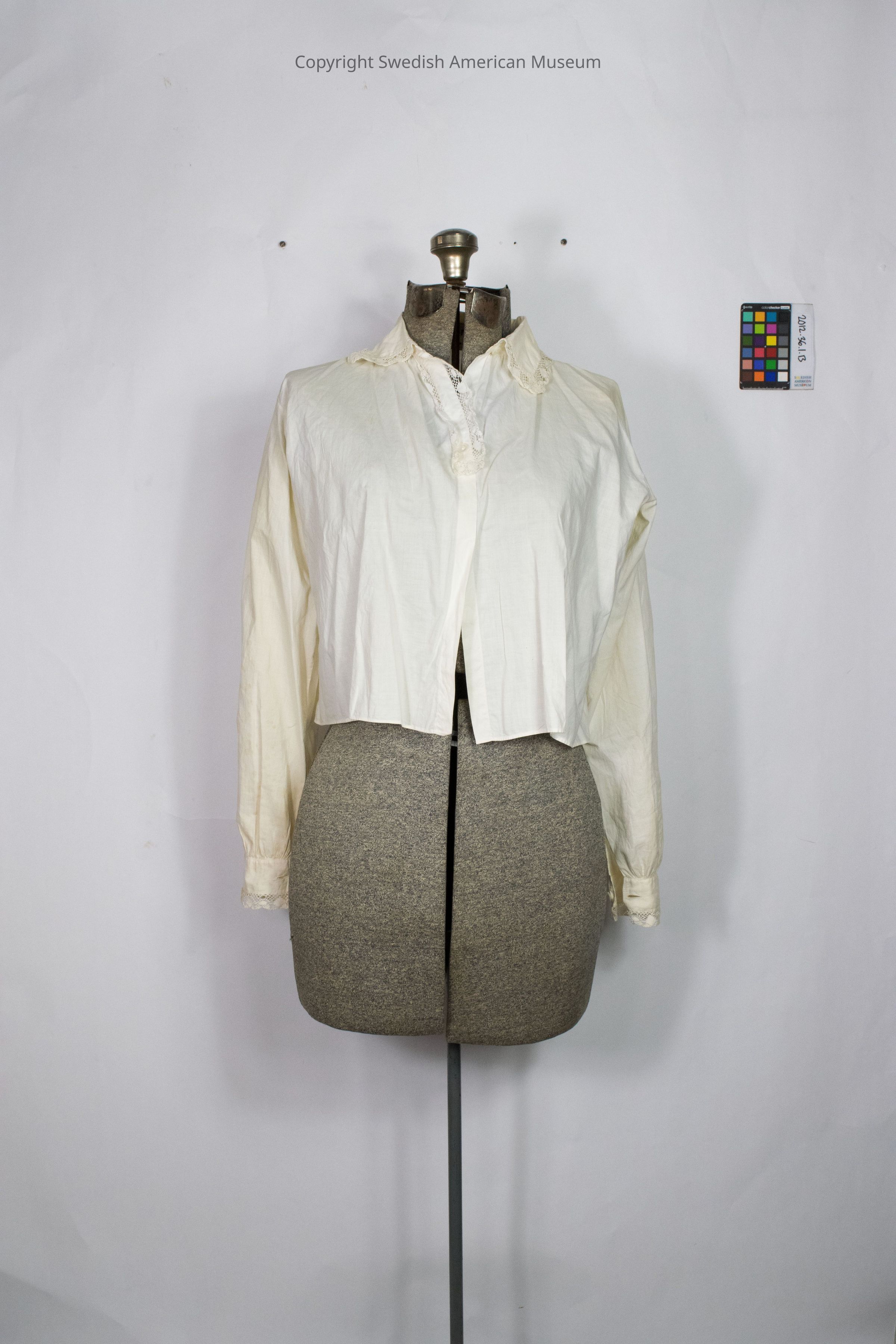 Blouse part of a Swedish folk costume (folkdräkt) from Skön, Västernorrland. Beige with lace trimming on the collar, in the area where the button slots are, and on the sleeves decorated with circles, ovals, and diamond shapes and cut-outs of diamond and trapezoid shapes.Context