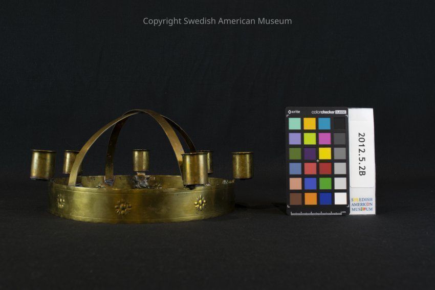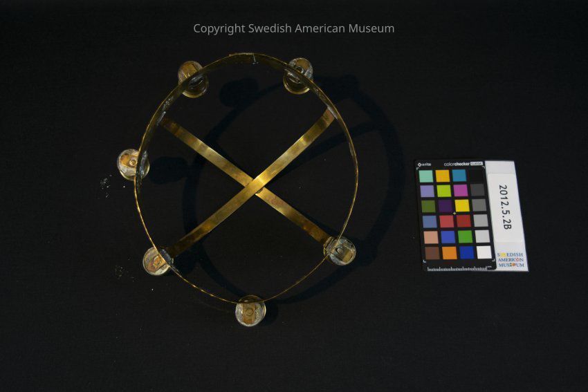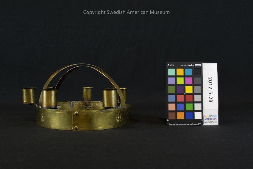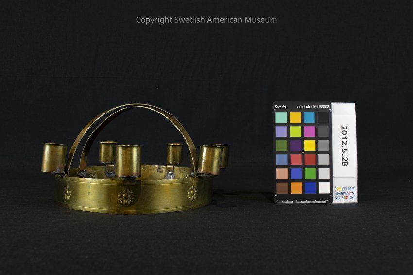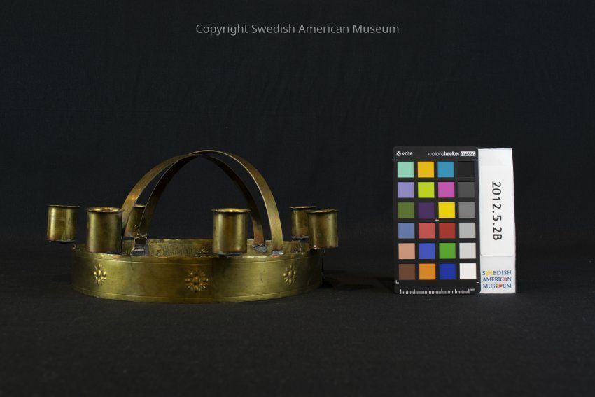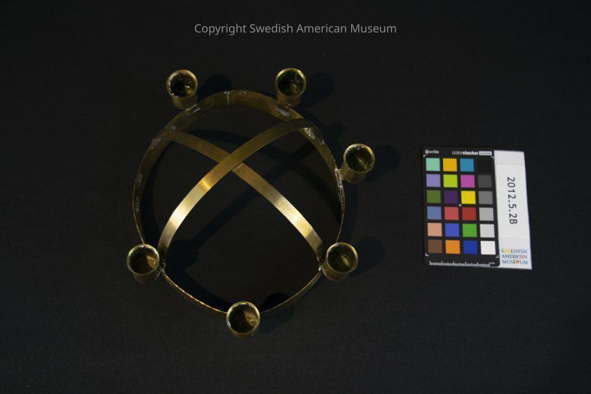 Lucia crown made of brass. Six round brass inserts with bases for candles. One insert is missing.Context