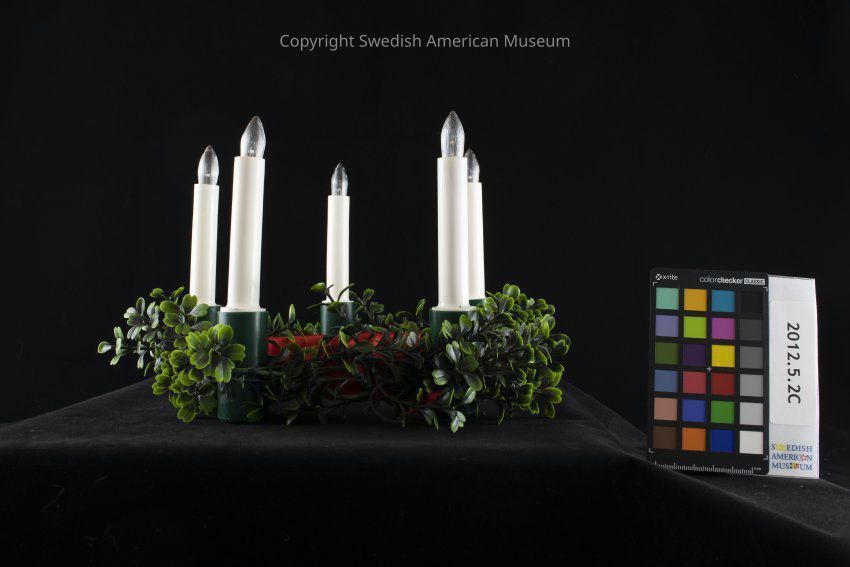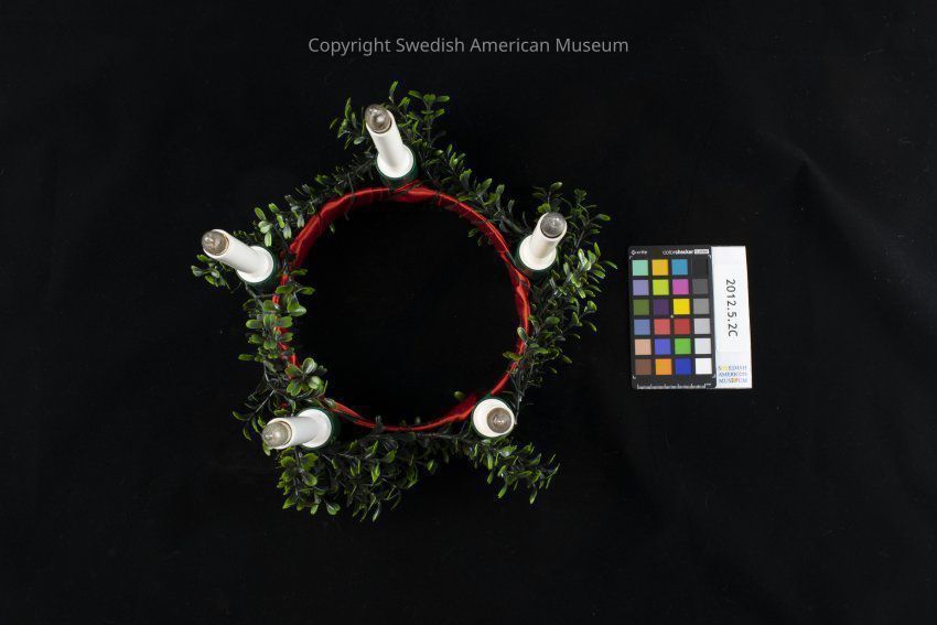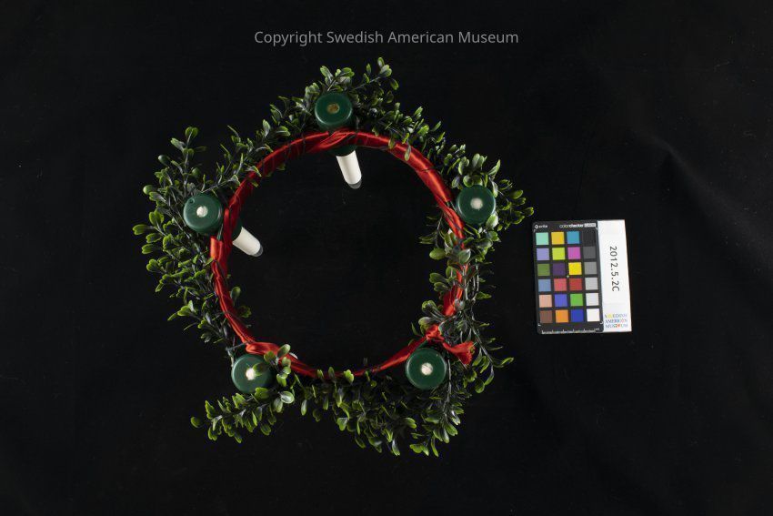 Green, plastic Lucia crown with five round inserts for candles. The crown is decorated with a red ribbon of synthetic material and green leaves made of plastic. Five white candles with round white plastic inserts fit into the somewhat wider and deeper green candle inserts.Context