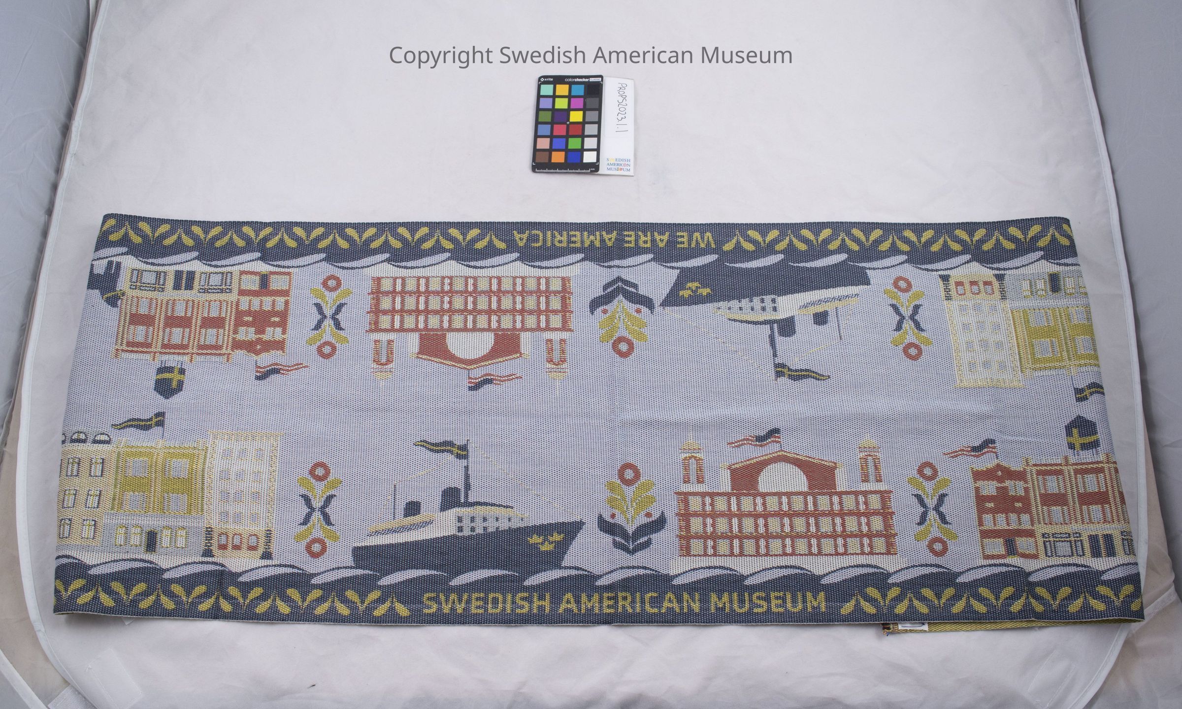 Organic cotton and flax table runner made by Swedish weaving company Ekelund Weavers in Horred, Sweden. The design was commissioned by the Swedish American Museum to be sold in the Museum store in relation to the opening of the permanent exhibit We Are America in 2024. The design features the immigration house in Gothenburg, a Swedish American Line ship, Ellis Island, and the building of the Swedish American Museum on 5211 N Clark St. The design is intended to follow a typical immigrant journey from Sweden to the United States in the early 1900s. Museum staff and volunteers were involved in deciding the final design. The table runner reads "We Are America" and "Swedish American Museum" and is mainly sky blue with a navy blue border with yellow text and yellow leaves. Rosemaling elements separate each building or ship. This table runner is a sample that was produced in 2023.Acquisition