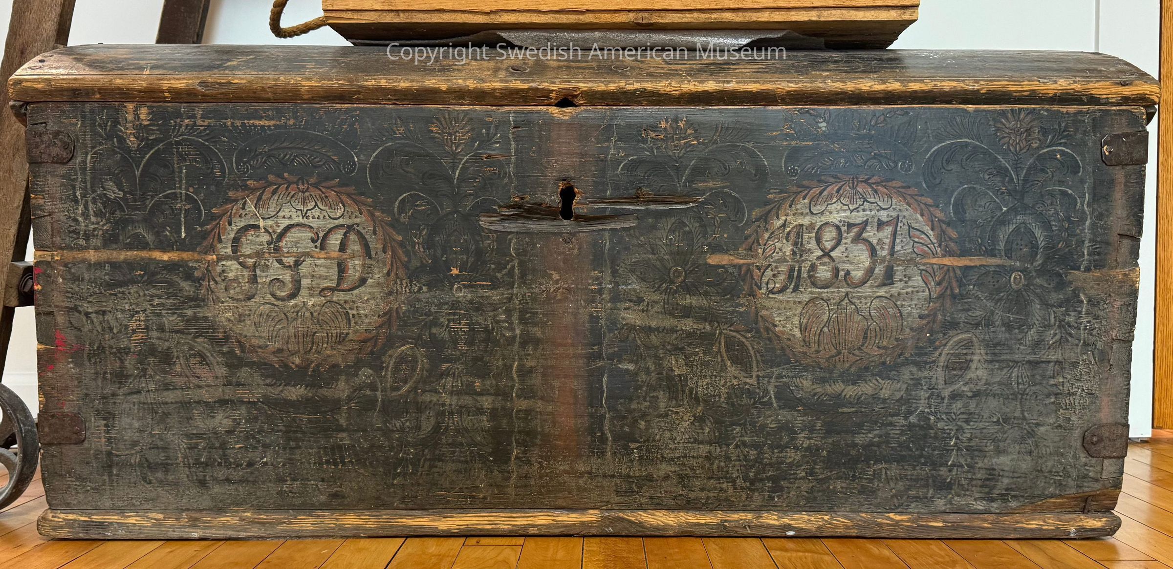 Large wooden trunk with square head nails holding it together. Some nails still have wooden plugs over them. The front has a keyhole and is painted with flower designs and two insets, one reading "GGD" in cursive script the other "1837". Metal handle on either side.Acquisition