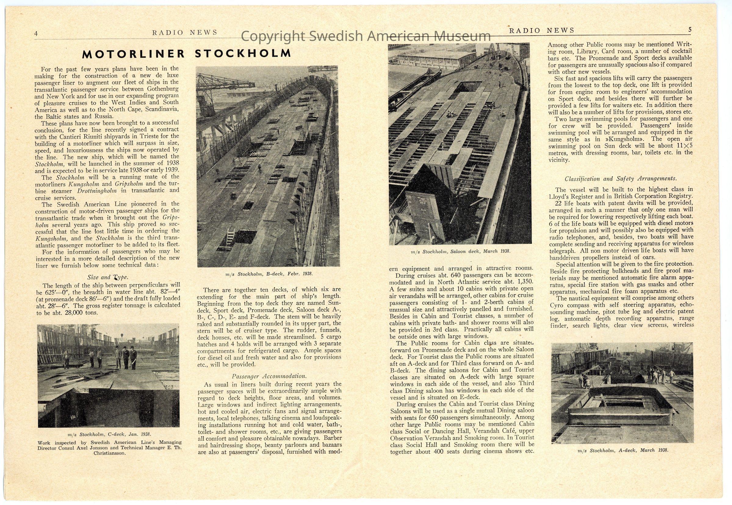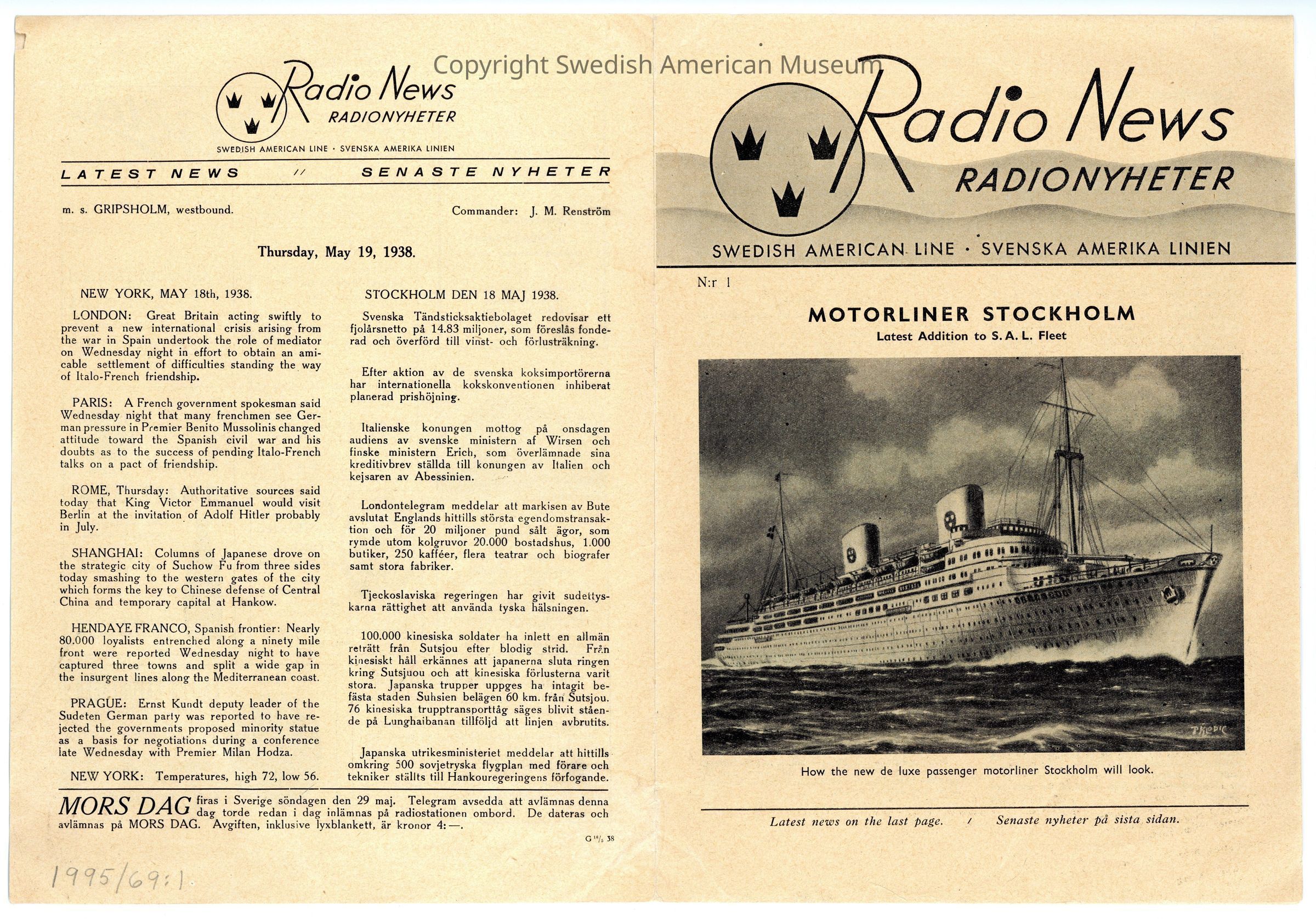 Swedish American Line newsletter titled "Radio News", an on-board newsletter, with information on the ship, activities, and international news for May 19, 1938, and more specifically on Sweden.Context