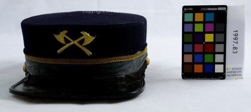 Marching hat. Blue felt top with light blue velvet border and gold braid. Gold crossed hatchets on front, black brim/visor, black ribbon around brim fastened with gold-tone buttons, two air holes on sides. Brown leather sweat bands. Hatches are small axes with short handles and a visor is the front part of a hat or helmet which protects the person from the brim or border of the cap and can be lifted to show the person's faceContext