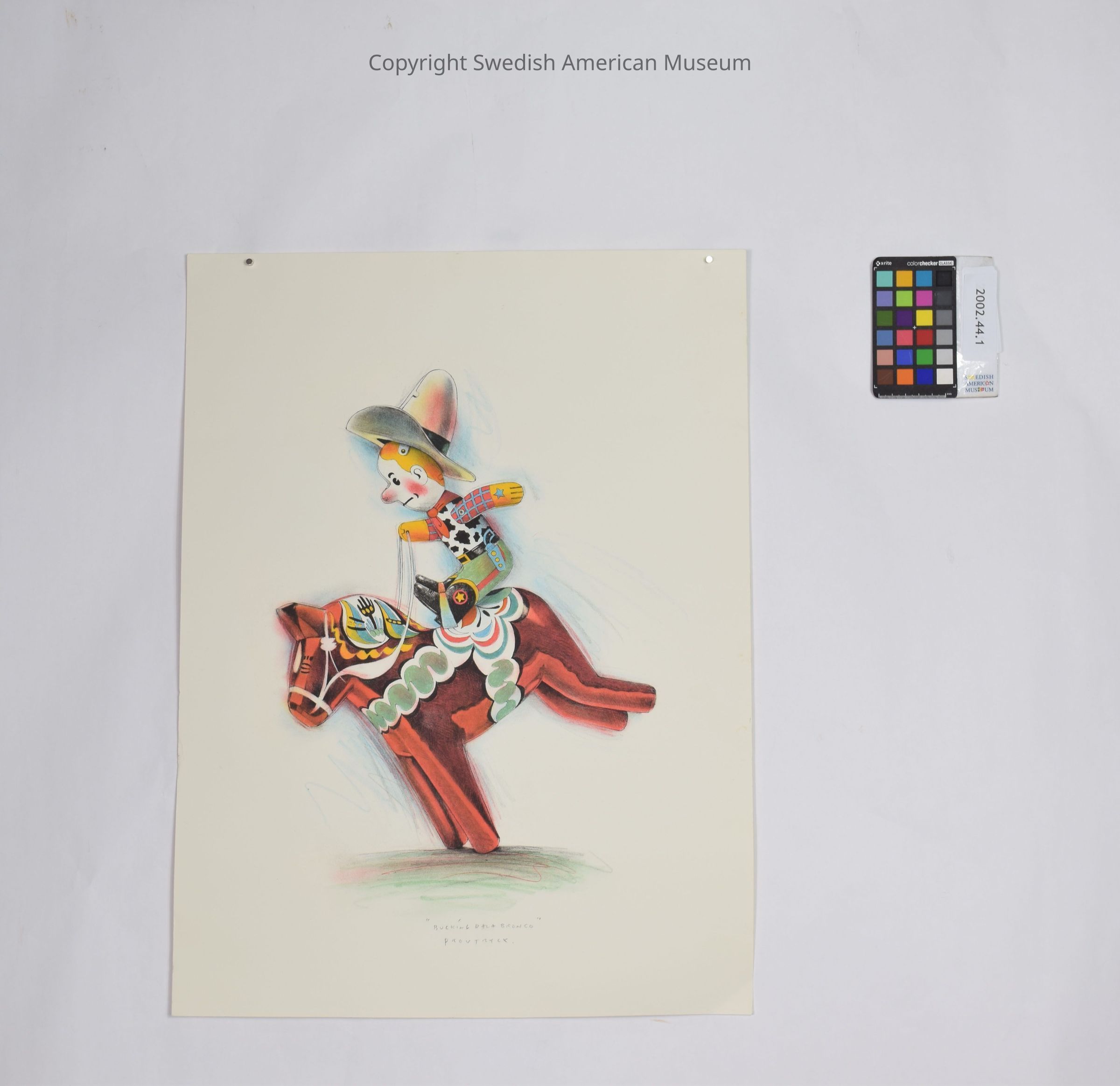 Lithograph called "Bucking Dala Bronco" by Lasse Åberg. The lithograph depicts a doll-like cowboy riding a red Dala horse. The horse is bucking (lowering its head and kicking its hind legs up and outward). The man is wearing a white and black shirt with blue, orange, and yellow sleeves, green pants, and black shoes. Lasse Åberg did this lithograph for the Chicago Exhibit.Type of Print